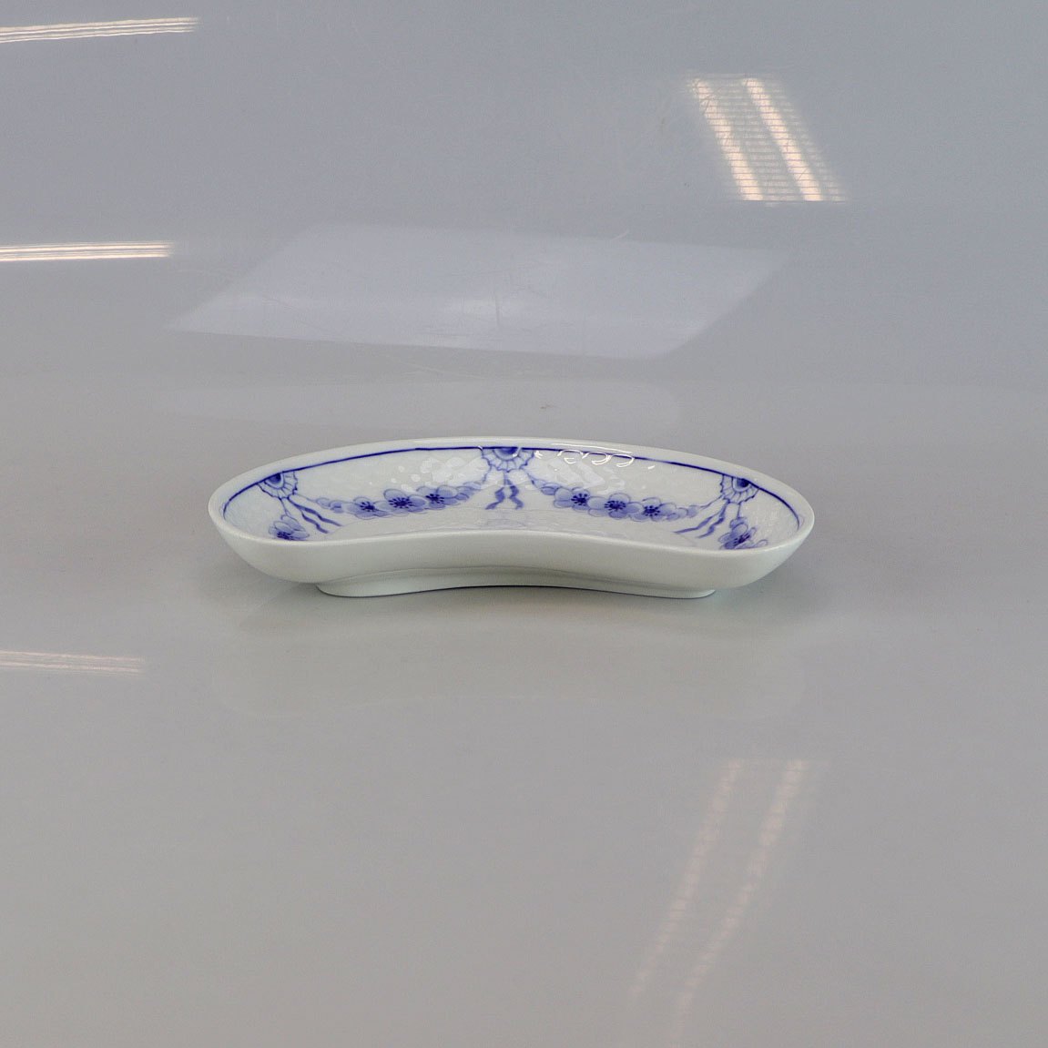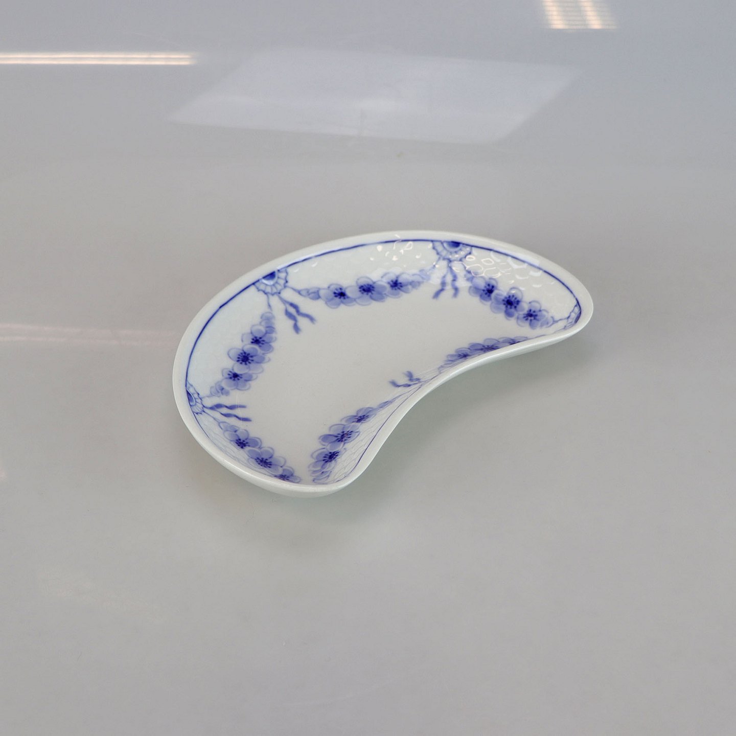 Asiet i hvidt porcelæn med skelform og motiv af guirlander med blå blomster