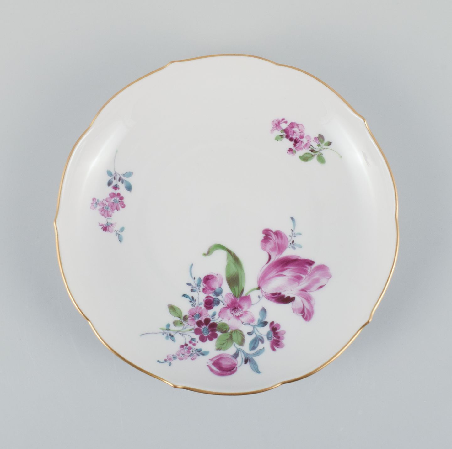 Seks antikke Meissen tallerkner, håndmalede med polykrome blomster og guldkant.