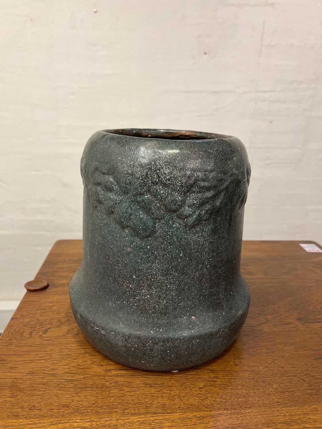 Jens Pedersen vase i glaseret lertøj med skønvirke dekoration. Udført hos Søren Kongstrand ca. 1910'erne. Vasen er fin, dog med små chips på skærven samt en hårrevne i bunden, se foto.