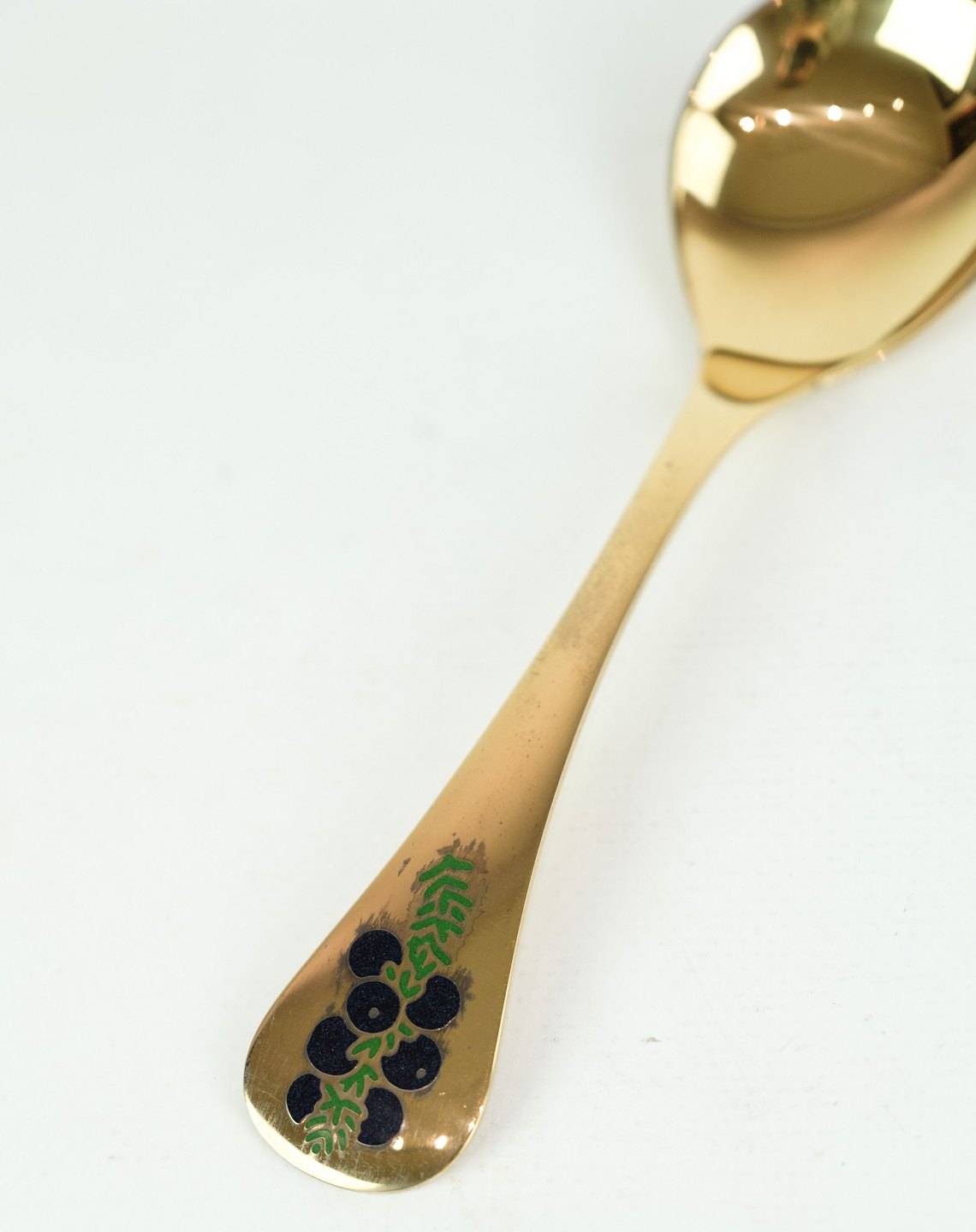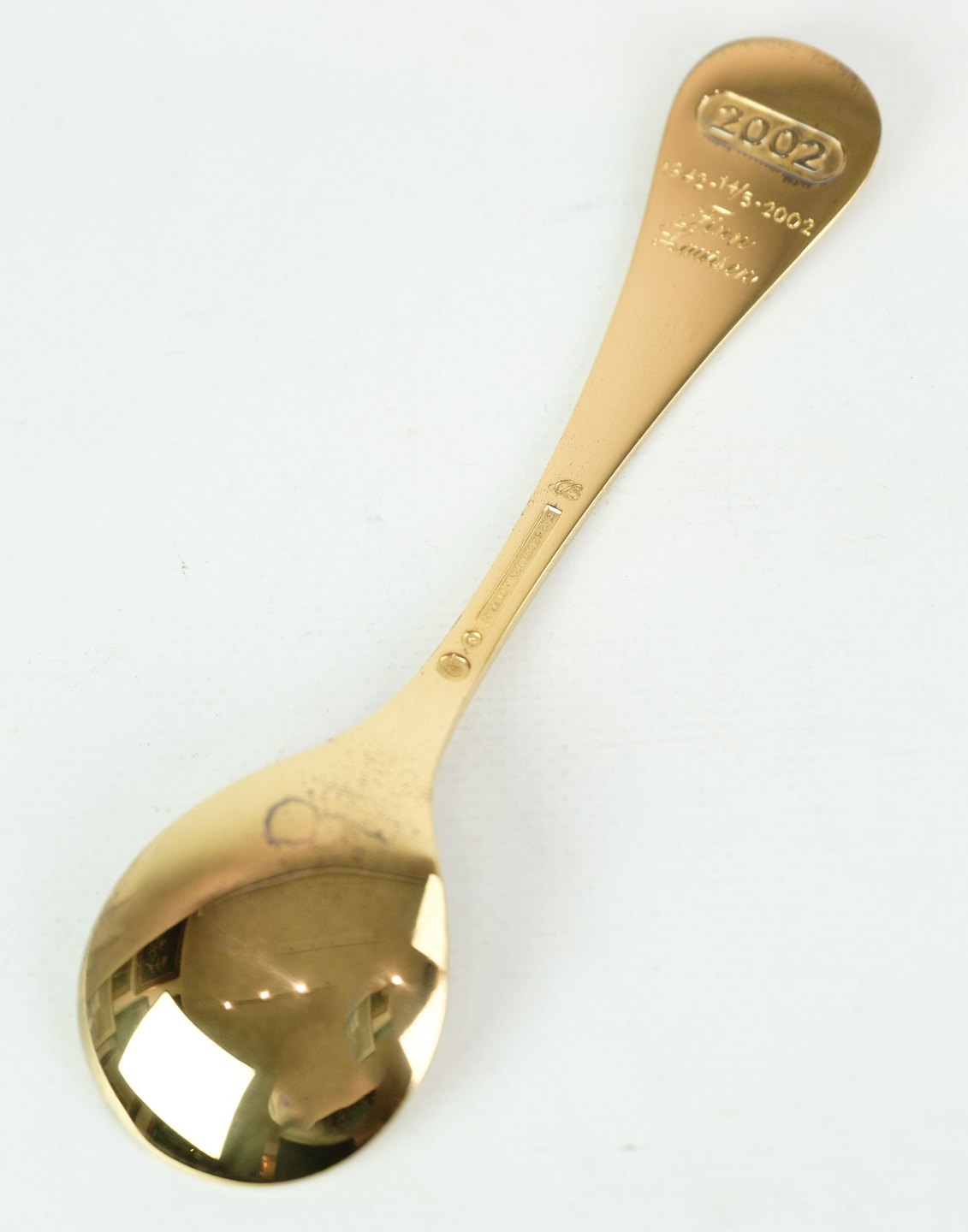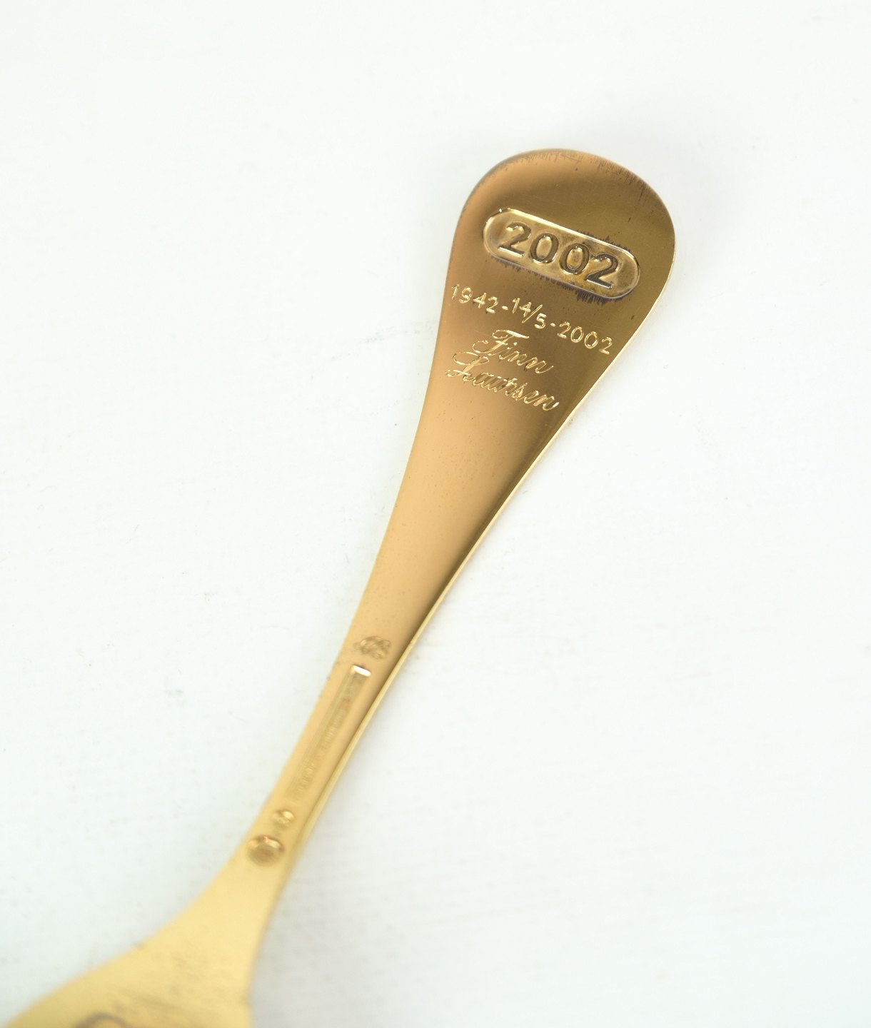 Georg Jensen har produceret en række årsskeer med forskellige blomstermotiver gennem årene. Denne ske er lavet i forgyldt sterling sølv og er i pæn stand. Designet af Annelise Bjørner, en dansk designer. Georg Jensen begyndte at producere årsskeer i 1971, denne ske er fra 2002, hvilket ville gøre den til en af de mellemste årsskeer i Georg Jensens serie. Den sidste årsske i serien blev produceret i 2004.