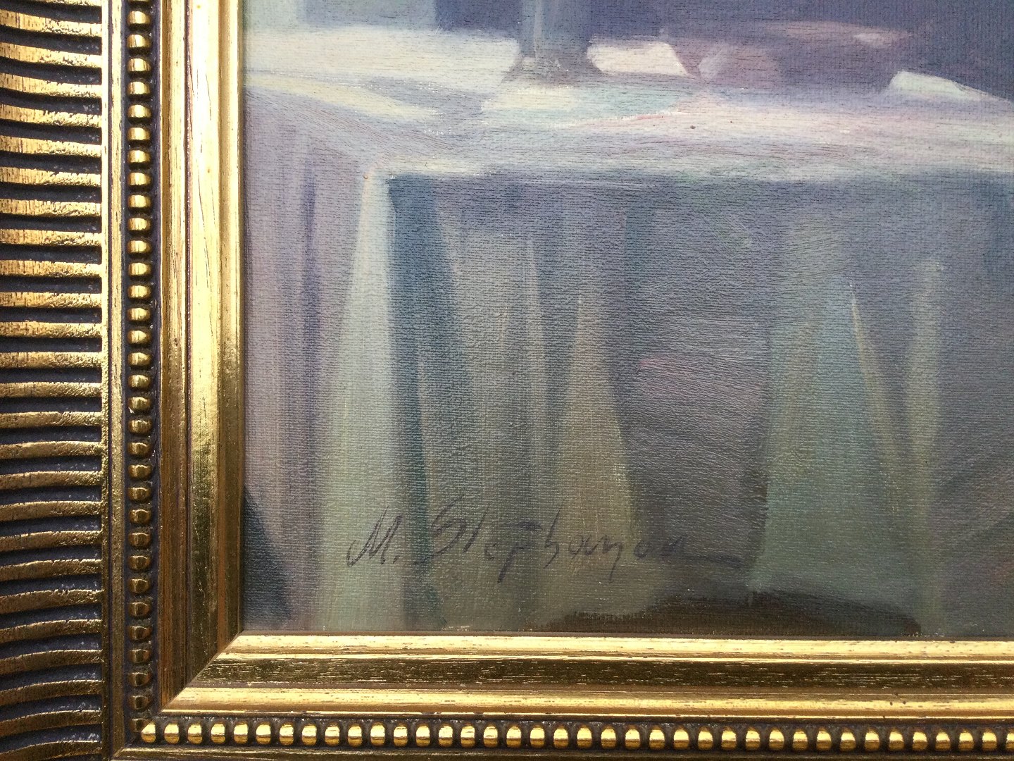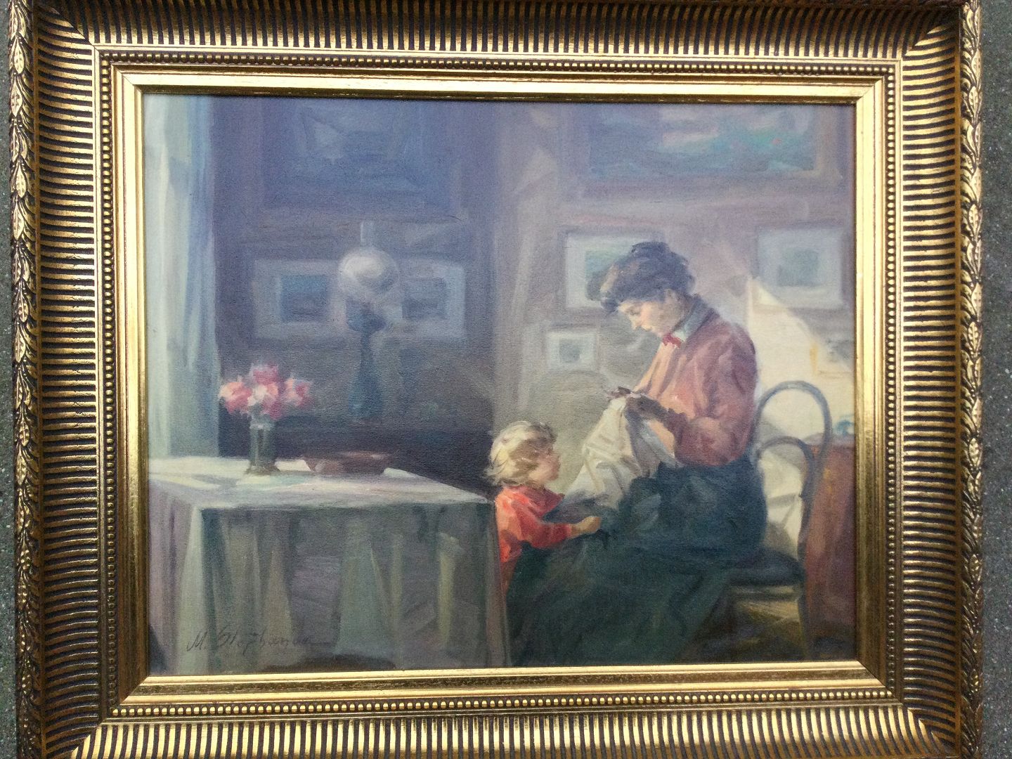 Maleri af Michael Stephánou - Interiør med kvinde med håndarbejde og barn.