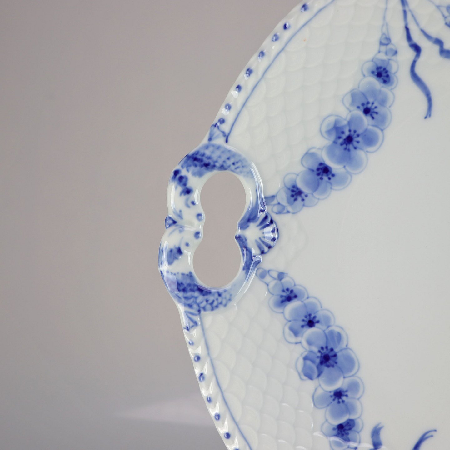 Fad i hvidt porcelæn med skelform og motiv af guirlander med blå blomster og søheste