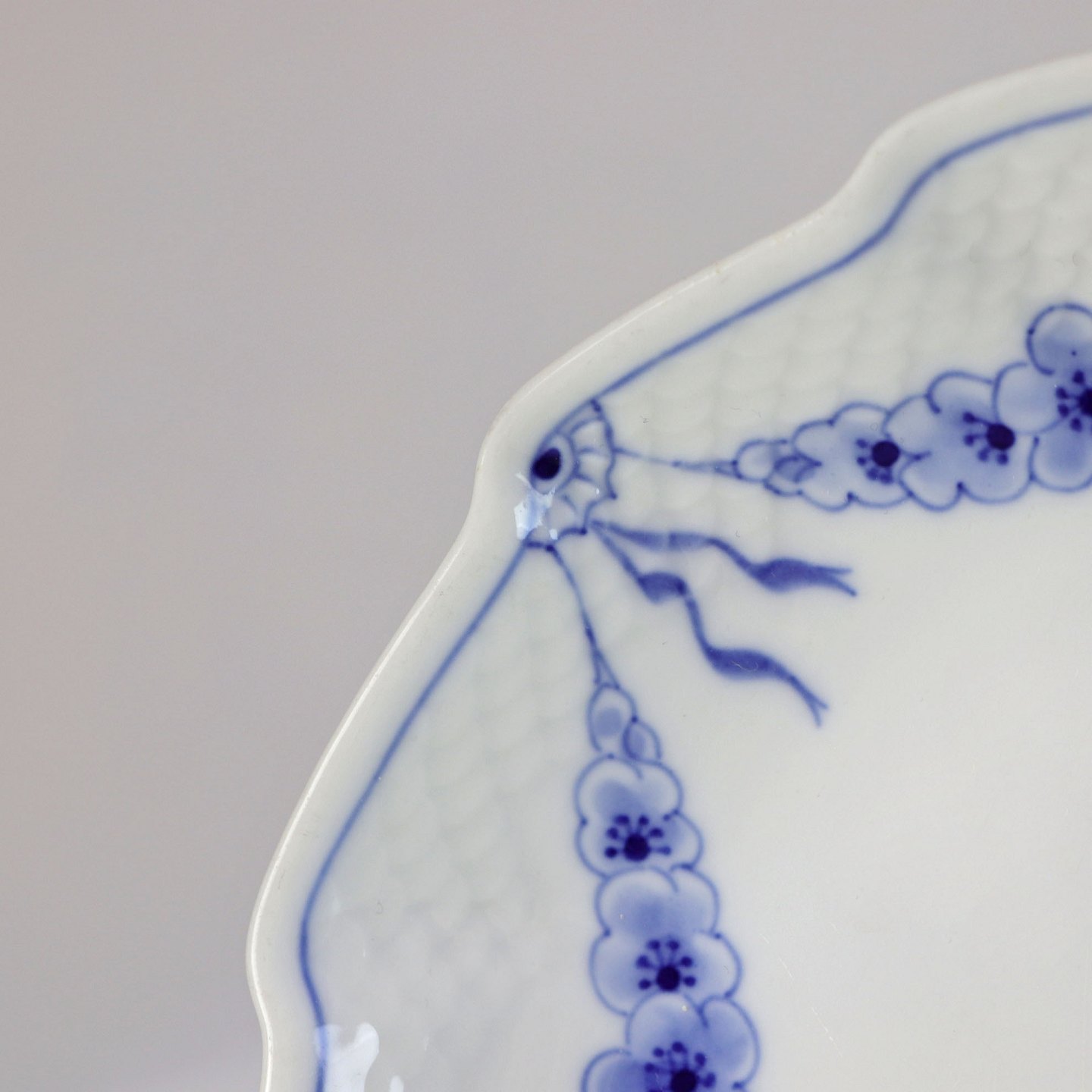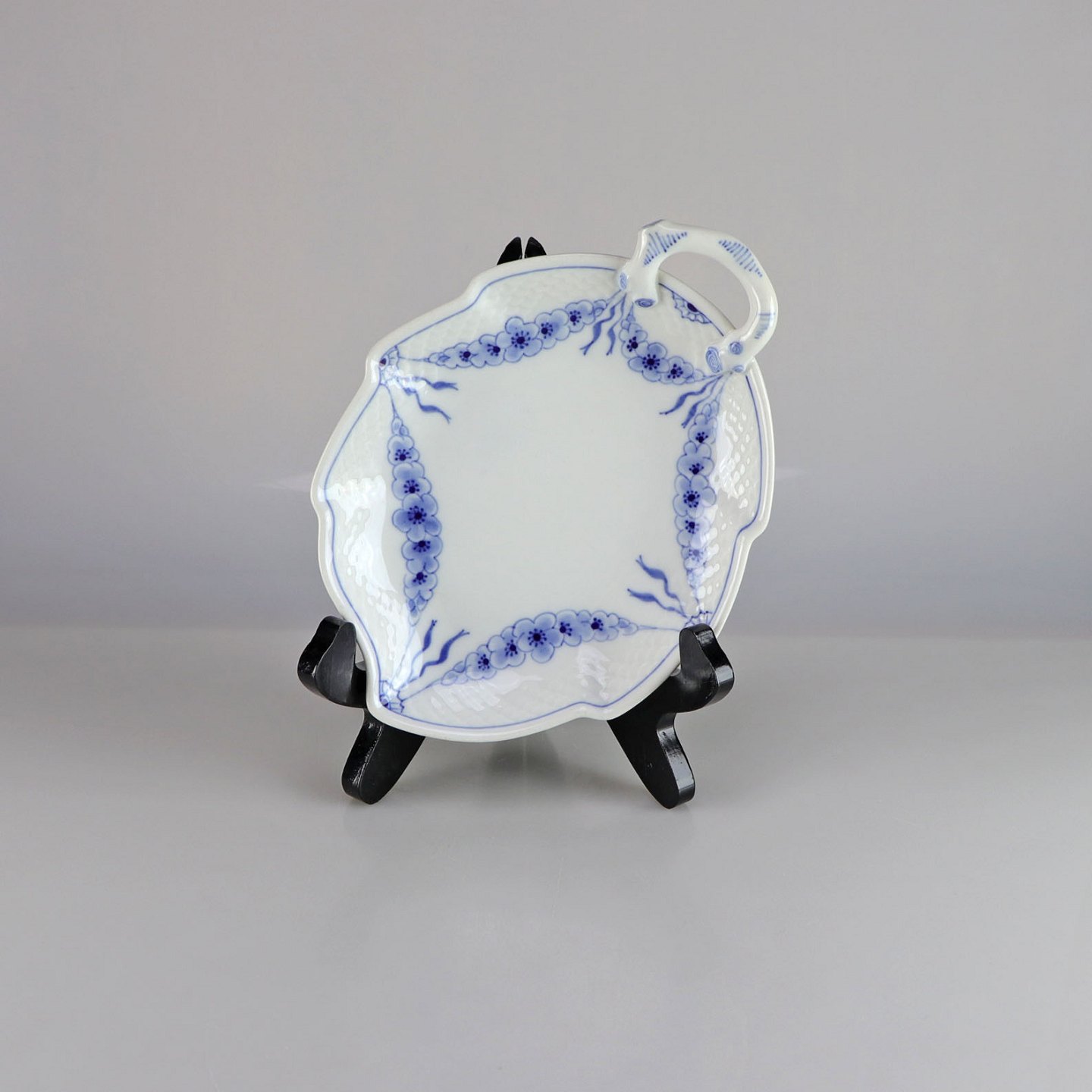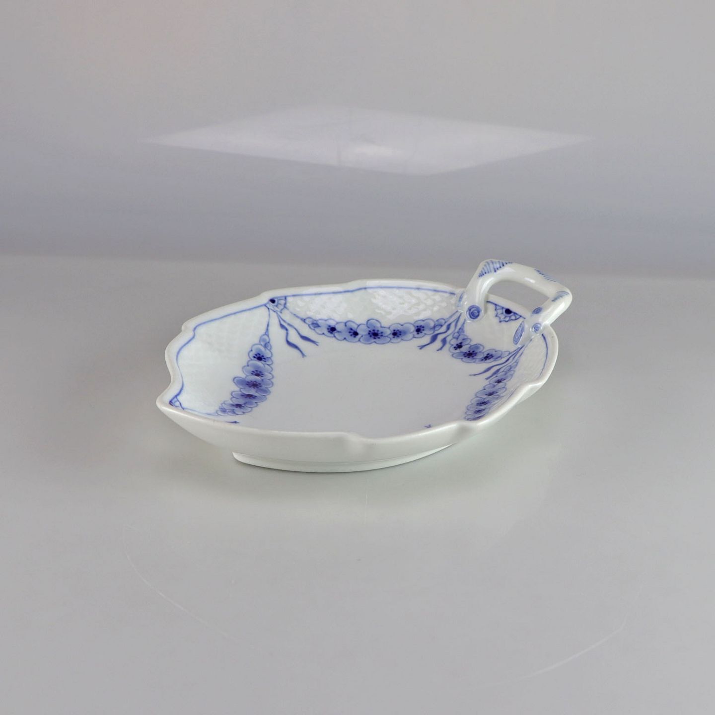 Kagefad i hvidt porcelæn med skelform og motiv af guirlander med blå blomster