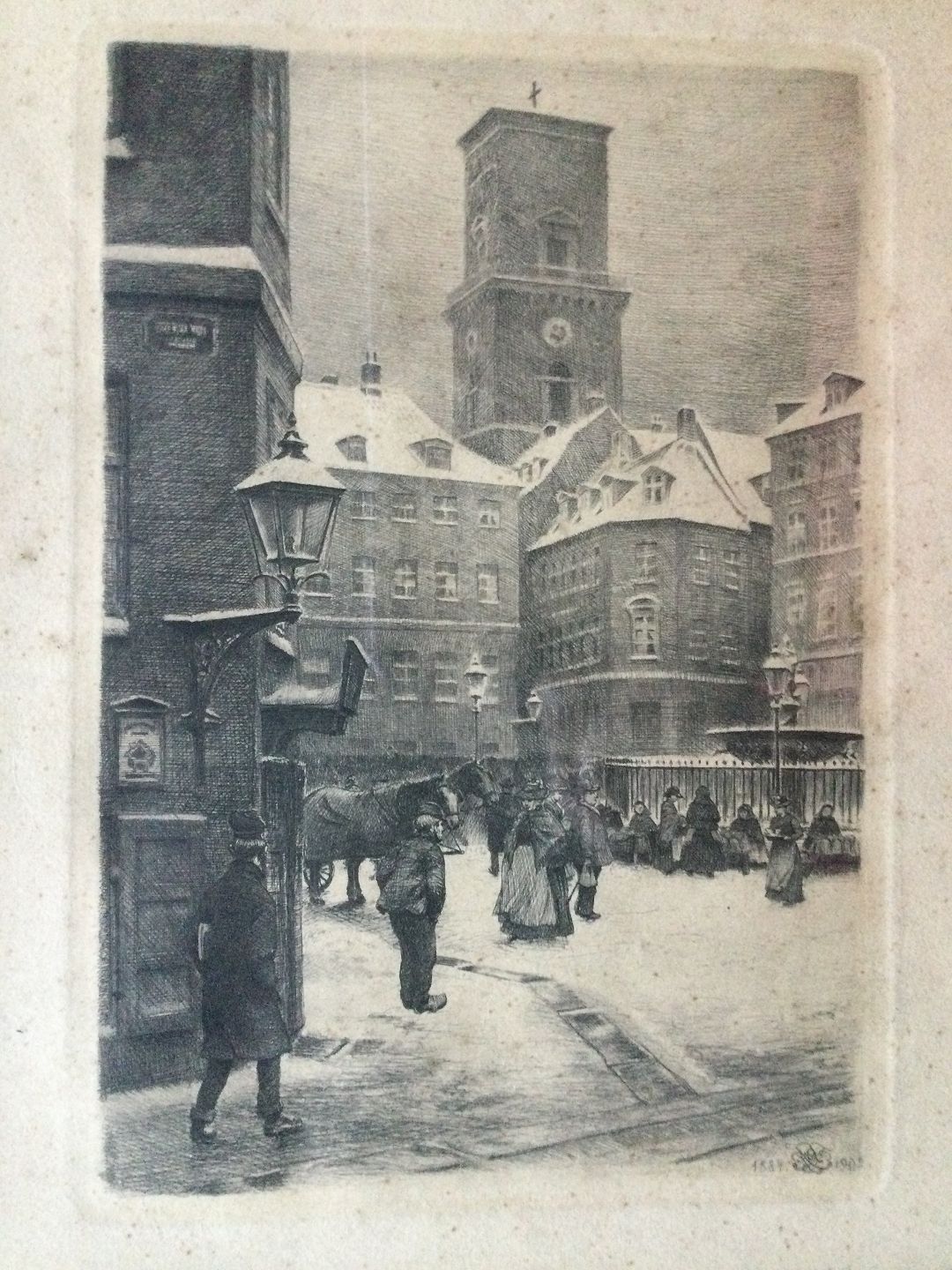 Radering af Peter Tom-Petersen - Gammel Torv i København, vinter 1902.