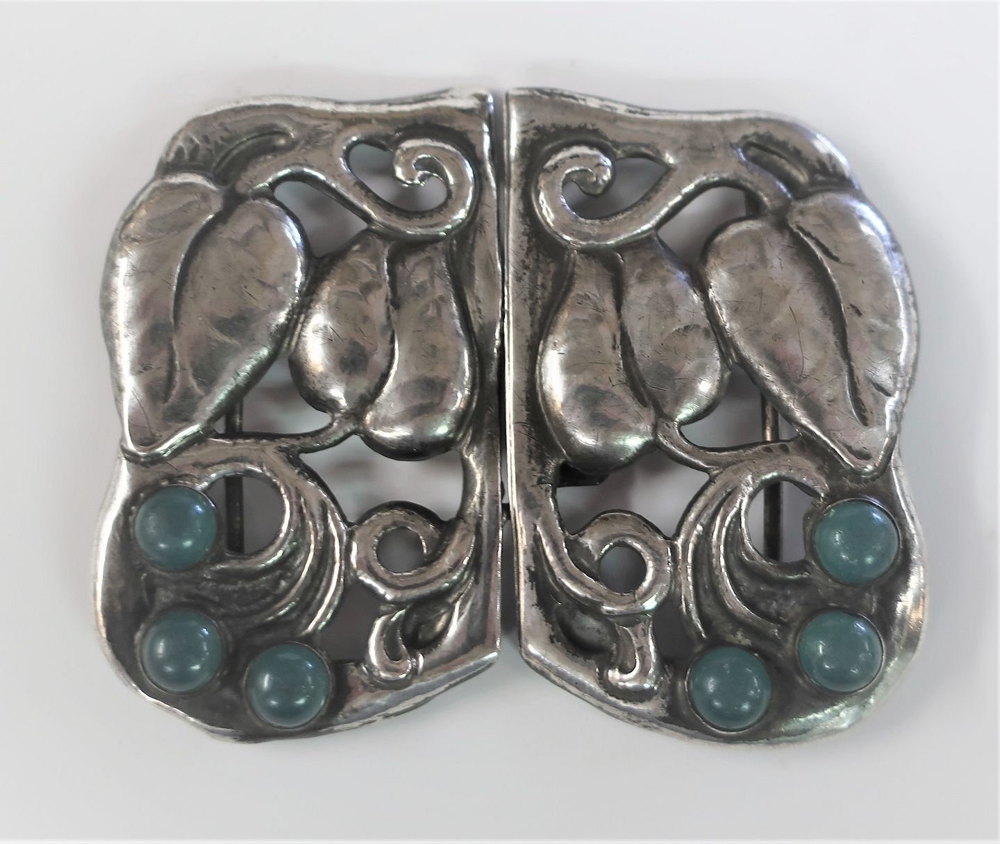 Jugend Sølv bæltespænde (830) med 6 grønne sten. Længde 7 cm. Bredde 6 cm. Stemplet 830S og IH i slyng.