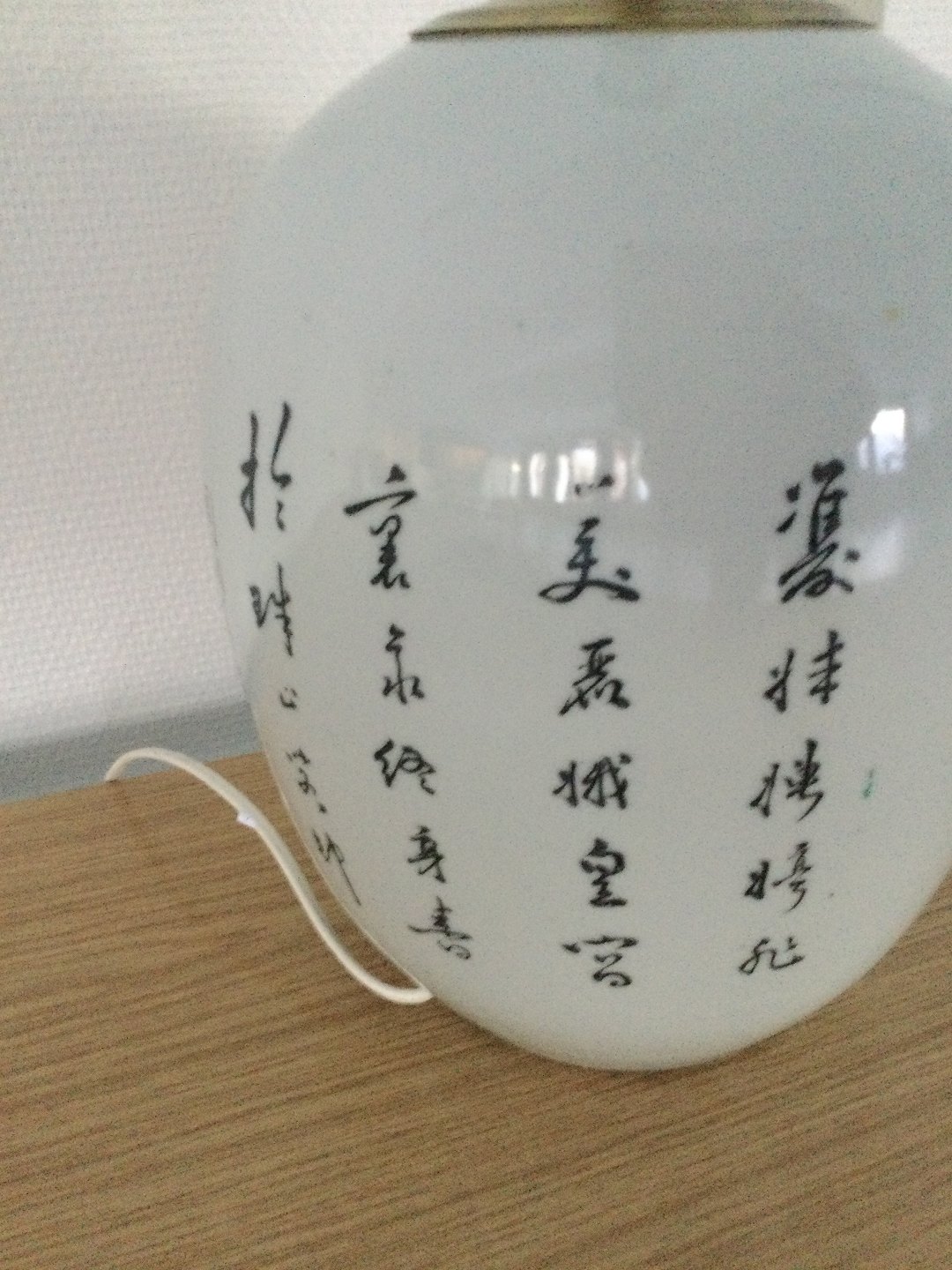 Stor kinesisk porcelæns lågkrukke omlavet til bordlampe.
