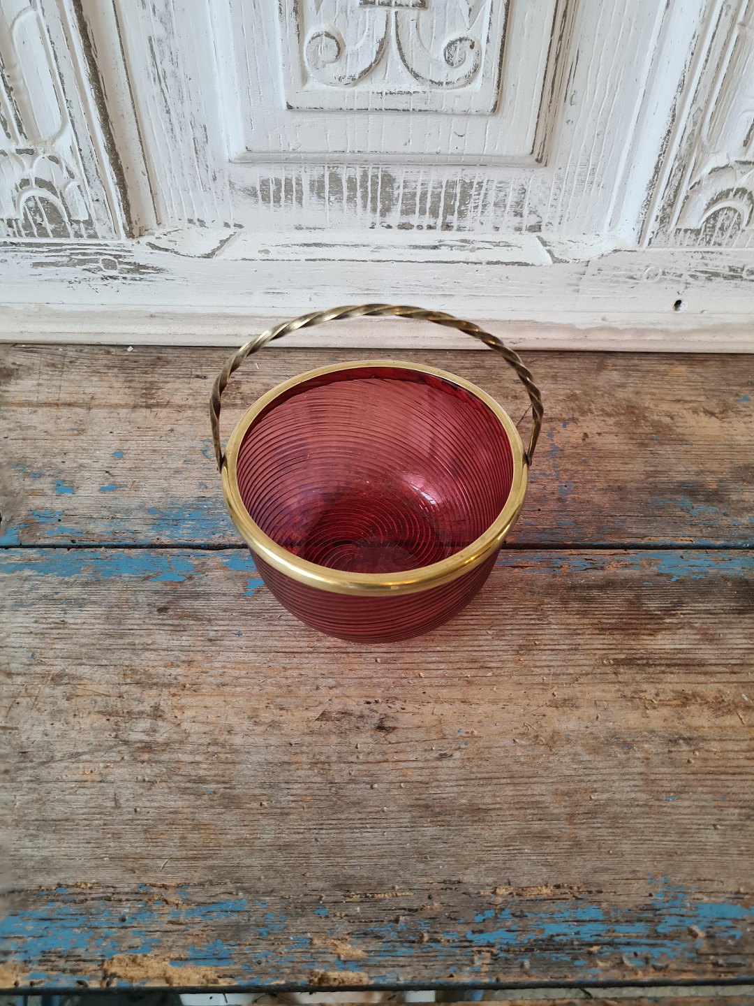 1800 tals sukkerskål i hindbærfarvet glas med messingmontering