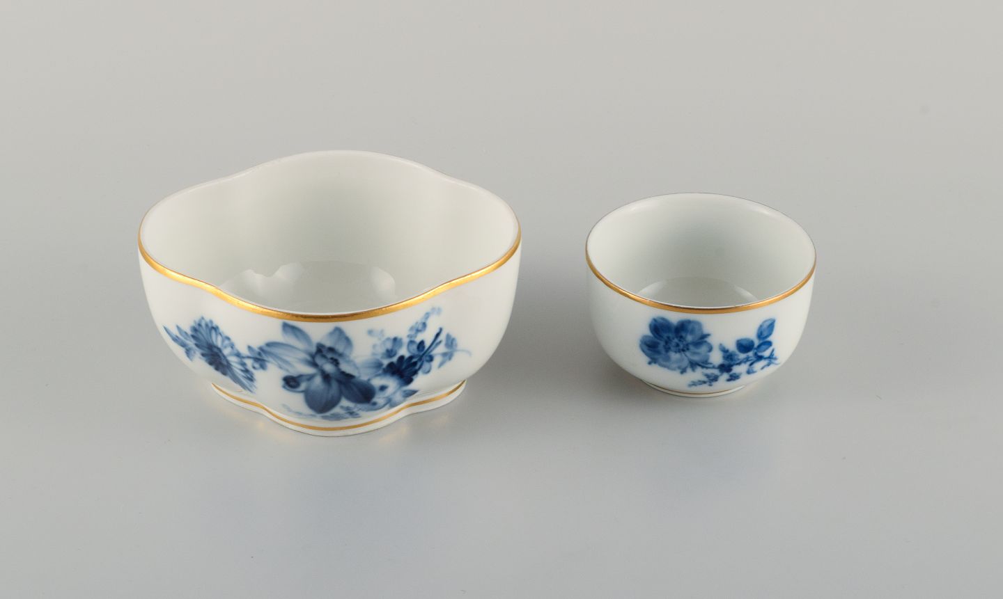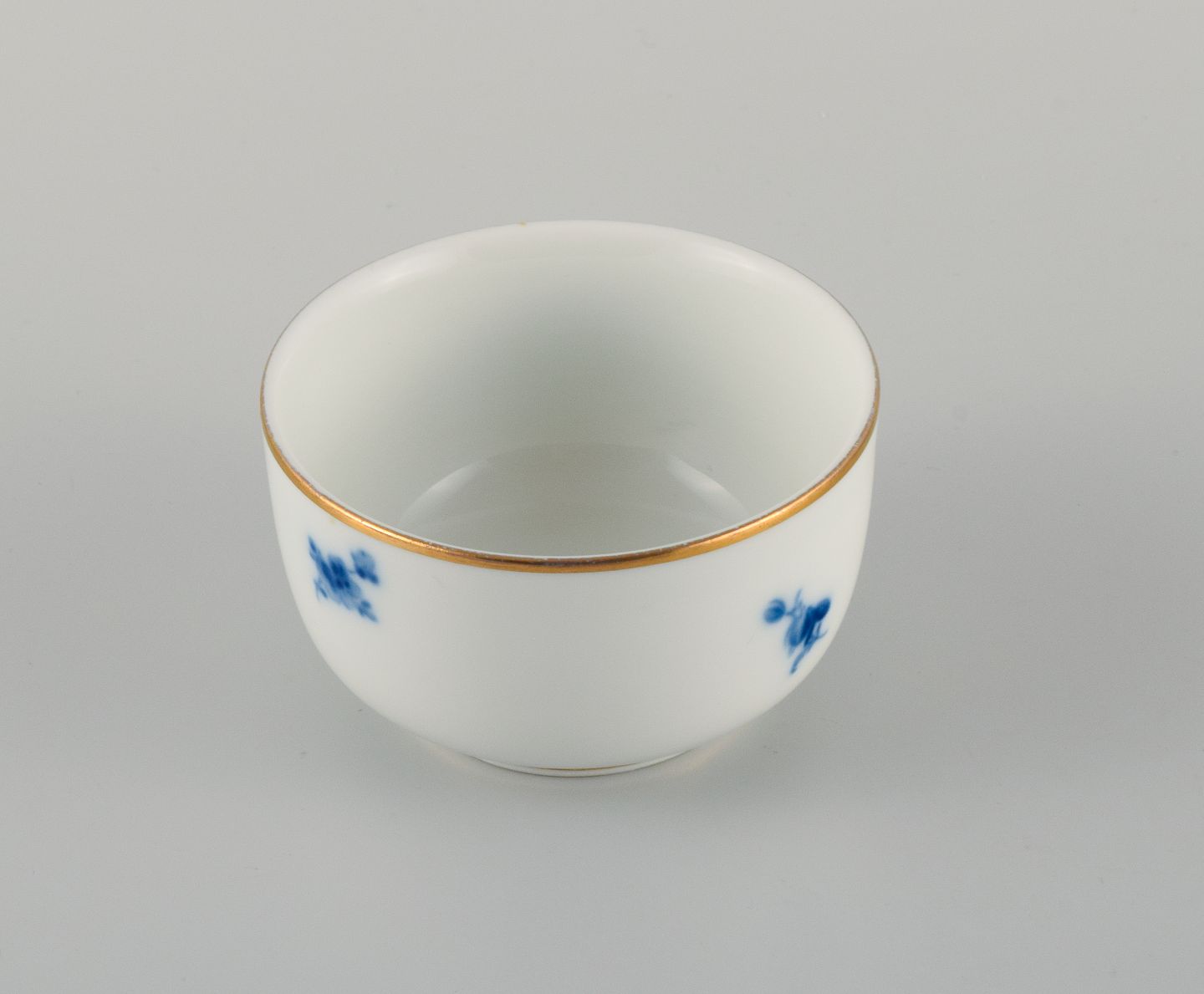 Meissen, two bowls hand painted with blue flowers and gold rim.