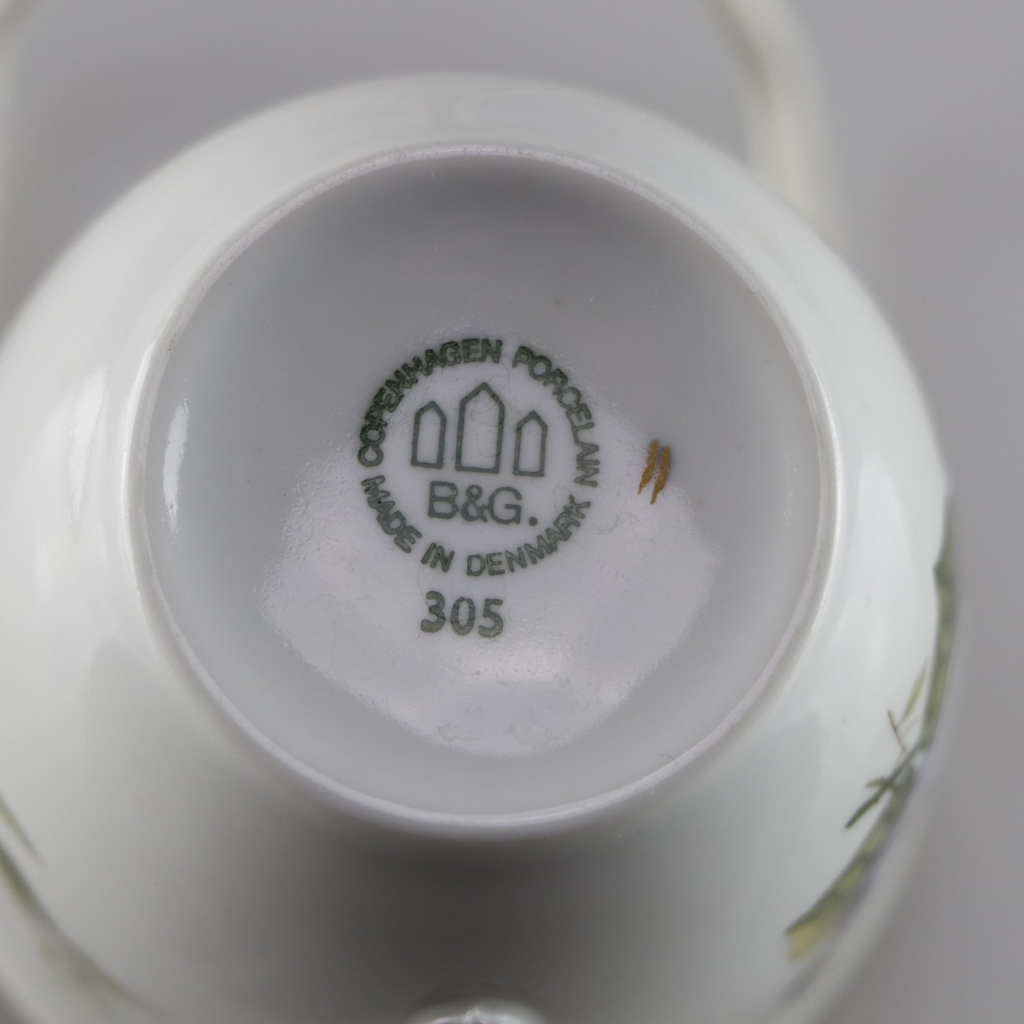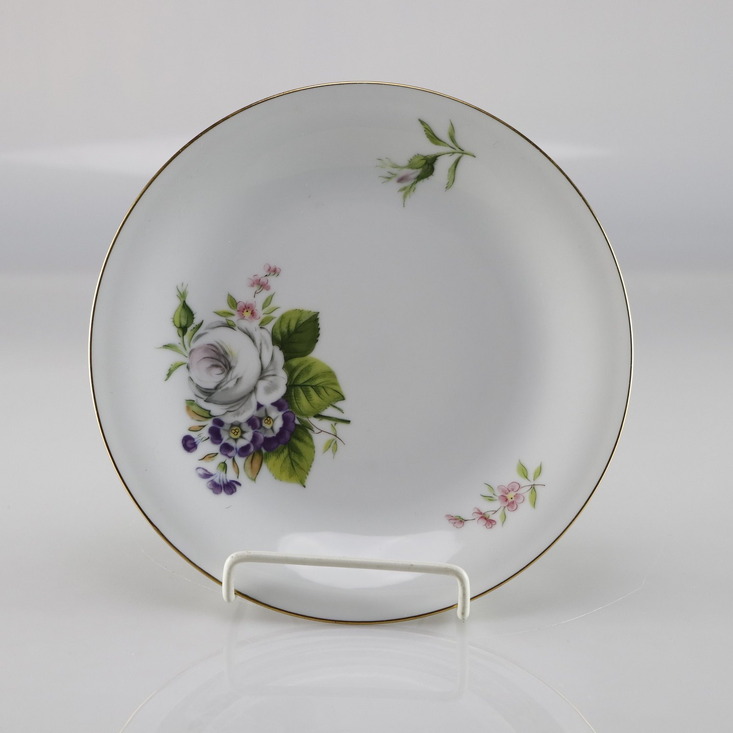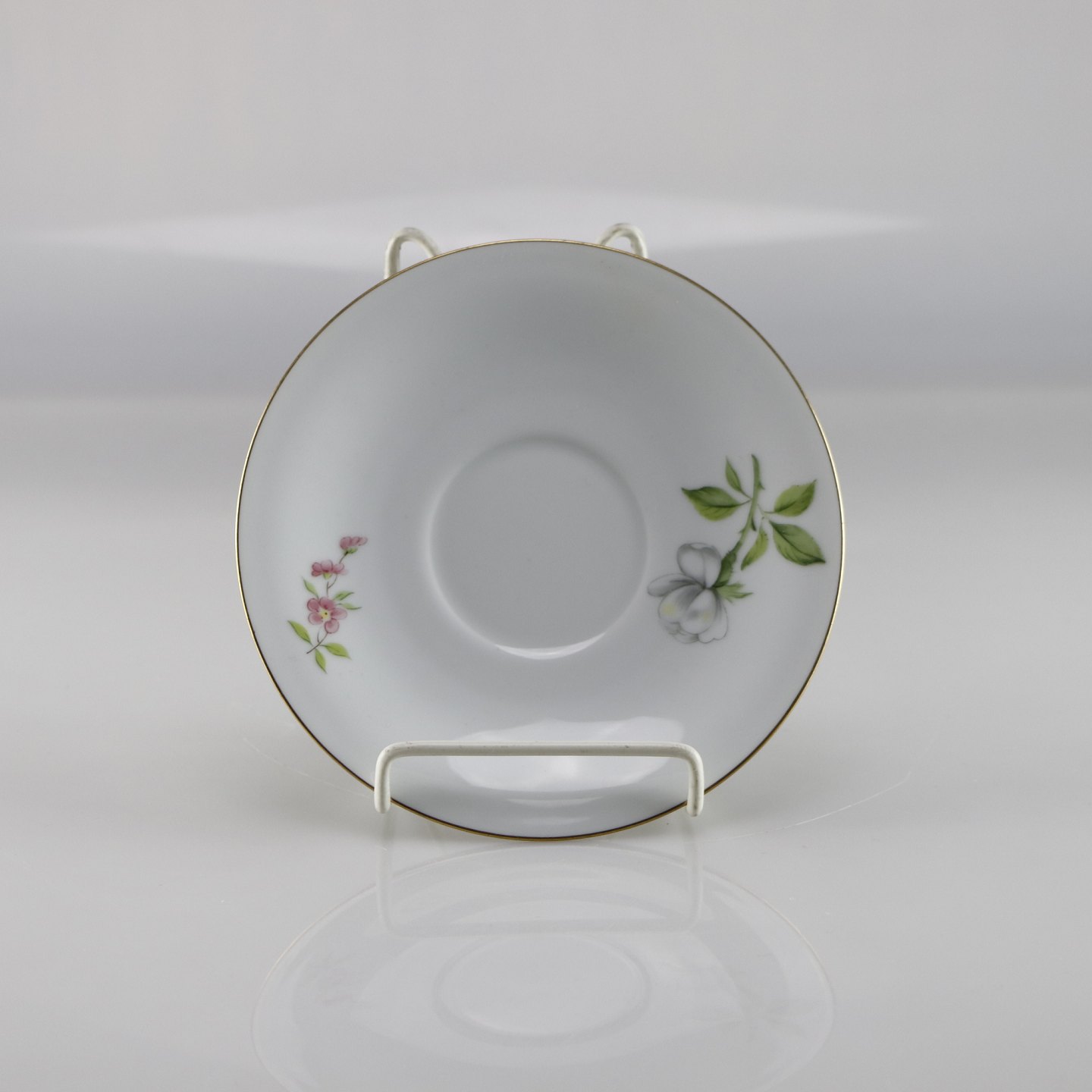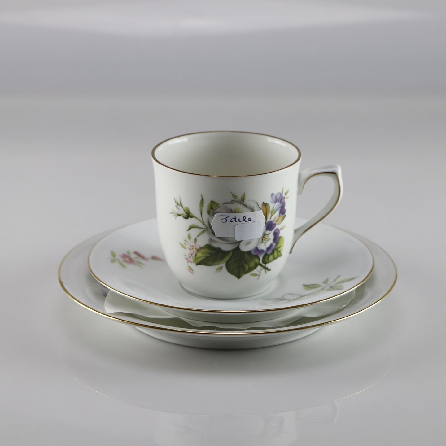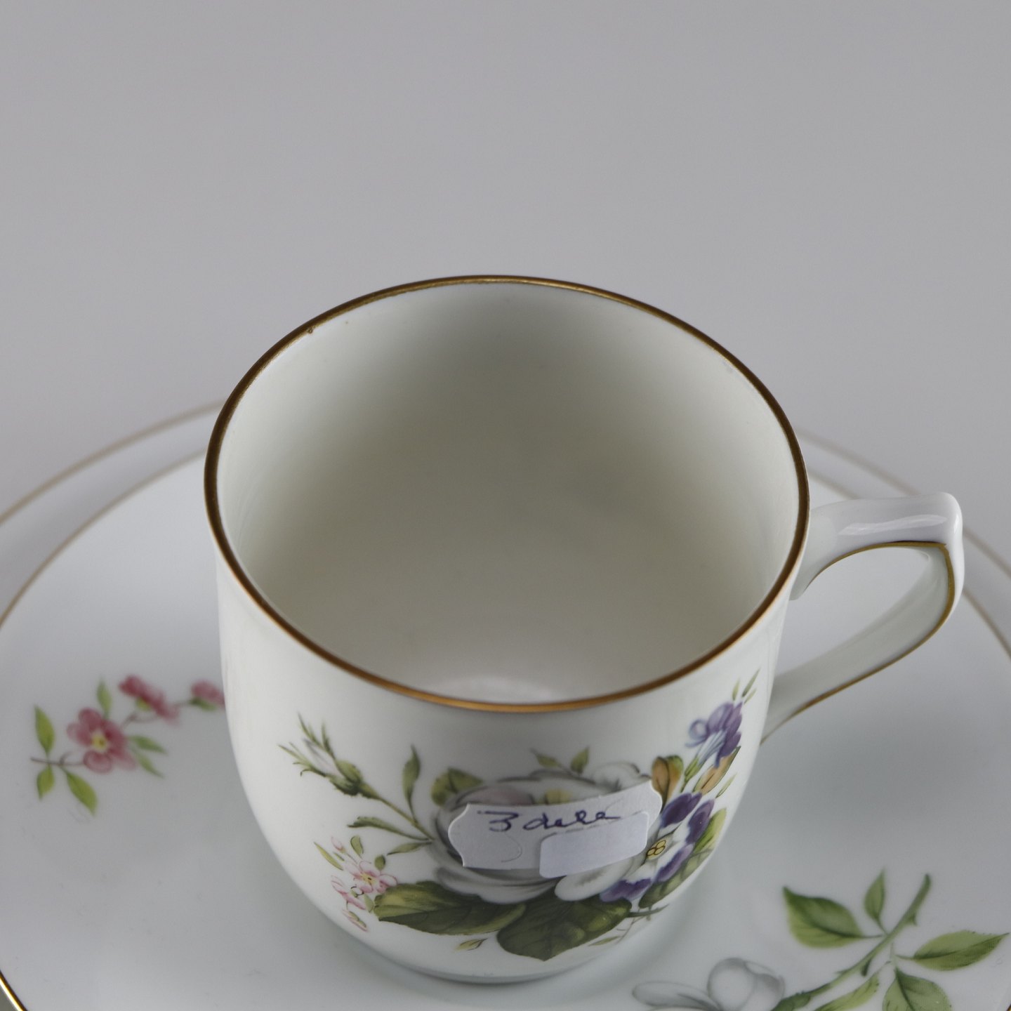 Porcelæns sæt af kaffekop med underkop og dessert tallerken med guldkant. Dekoreret med en hvid vild rose og violer.