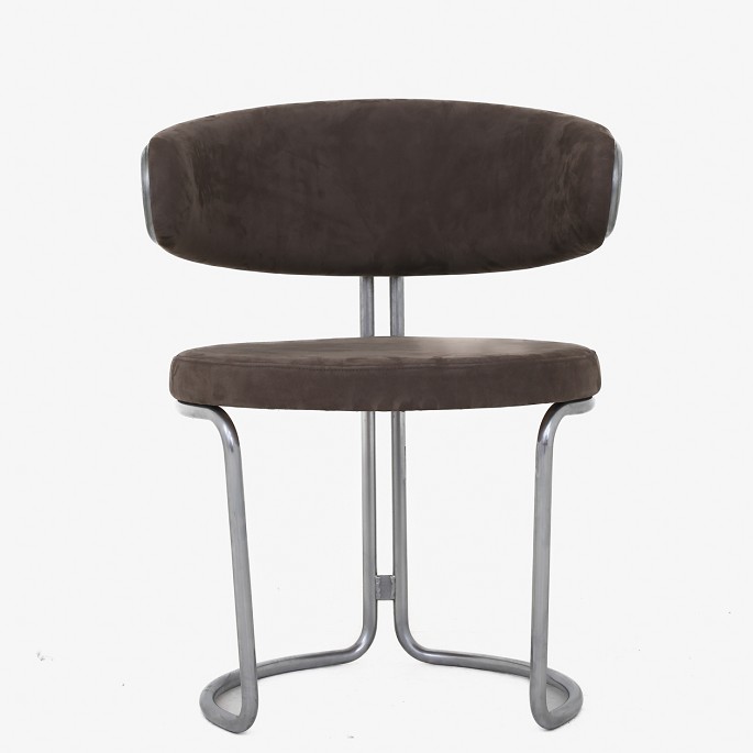 Spisestol i bøjet aluminium og nybetrukket med nubuck-læder (Royal Nubuck, farve: Stone). Disse er produceret i december 1972.