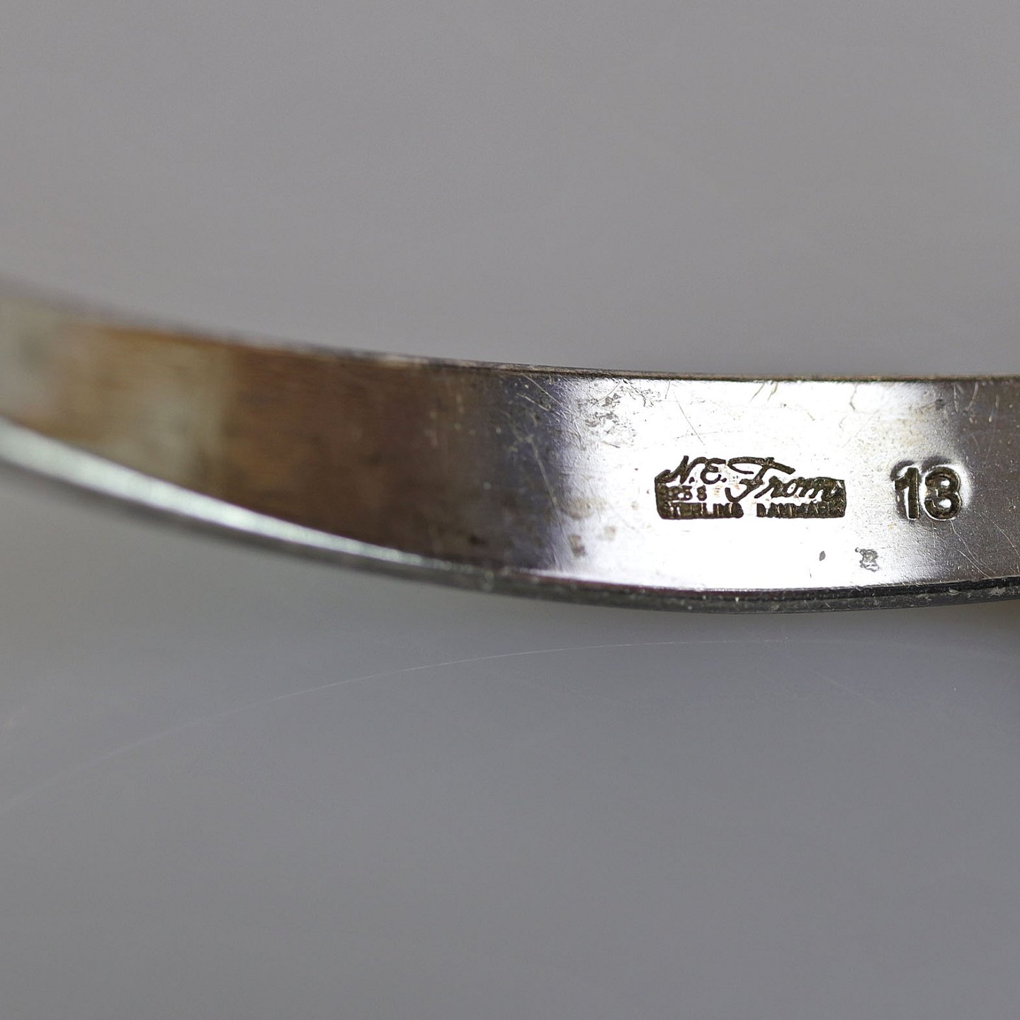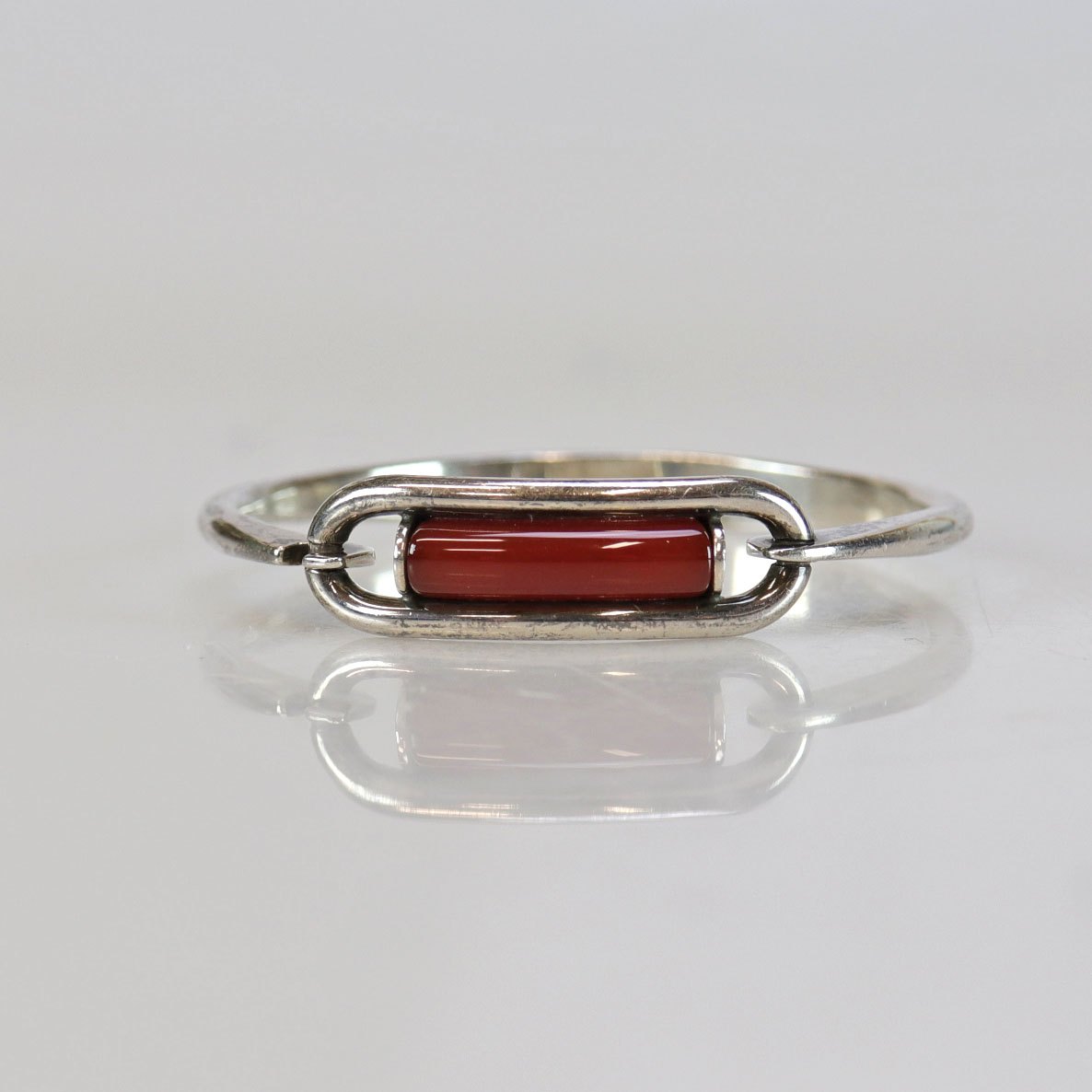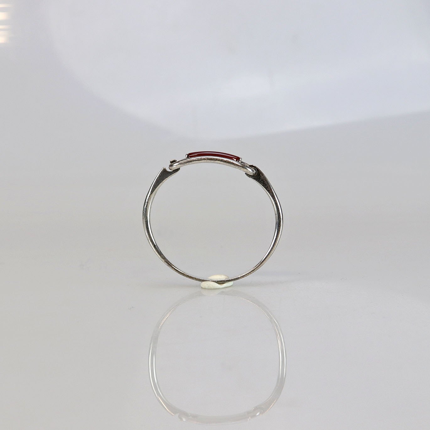 Sølv armring med aflang rød sten. Åbnes ved stenen