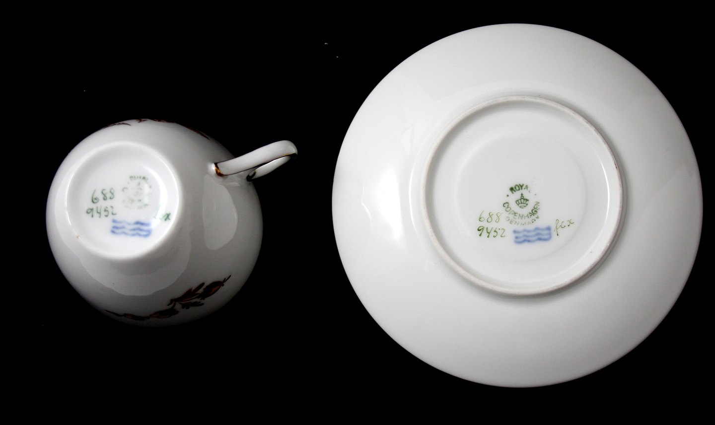Text available in Danish: Royal Copenhagen, Brun Rose, Kaffekop. Nr. 688/9452. Højde 6 cm. Diameter 7,5 cm. Underkop diameter 13,5 cm. I. sortering. Flot stand. Pris: 125 kr. stk. Lager: 6