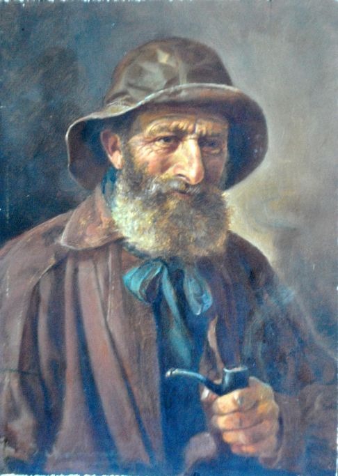 Ubekendt kunstner (19. årh.): Portæt af en fisker med pibe. Olie på træ. Signeret. 25,5 x 18,5 cm.