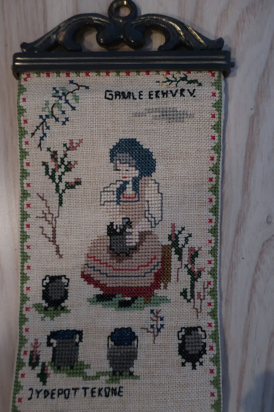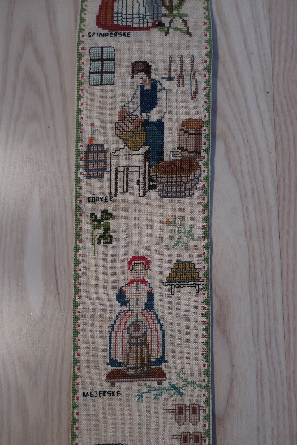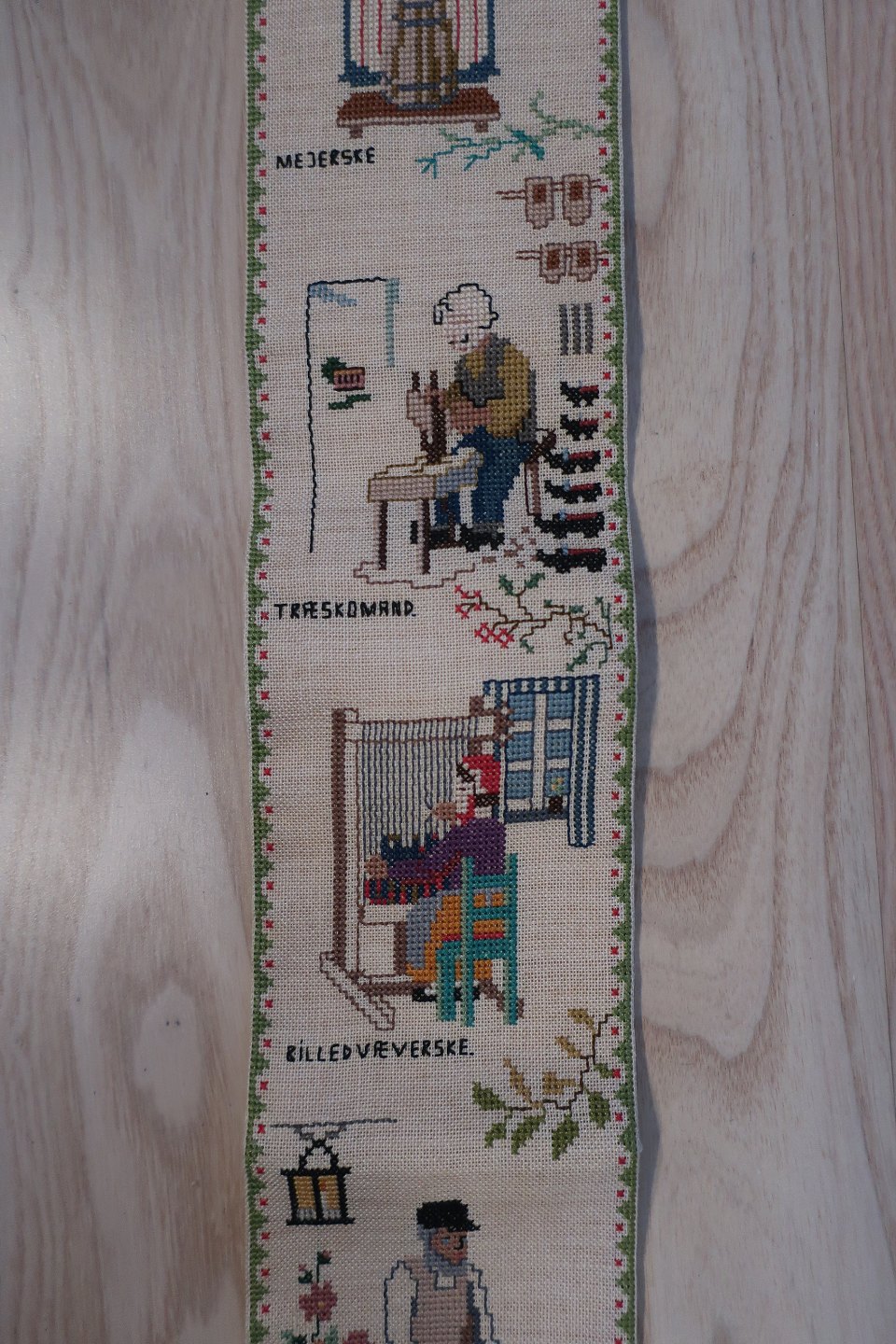 Gammel klokkestreng med broderi til illustration af 8 gamle forskellige erhverv: Jydepottekone + Glaspuster + Spinderske +Bødker + Mejerske + Træskomand + Billedvæverske + Hjulmand