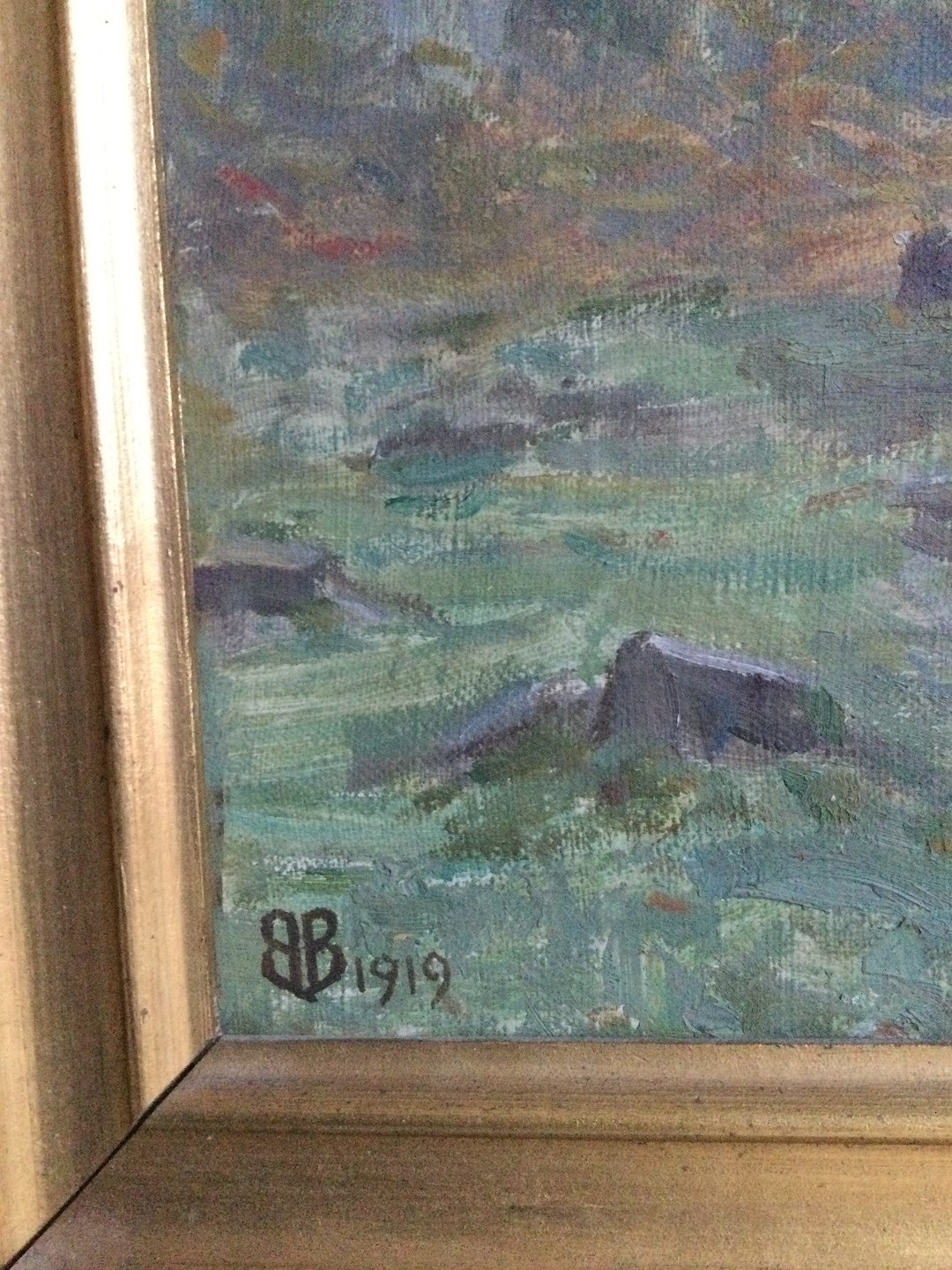 Maleri af Brita Barnekow - Skovparti med dreng og ko i lysning 1919.