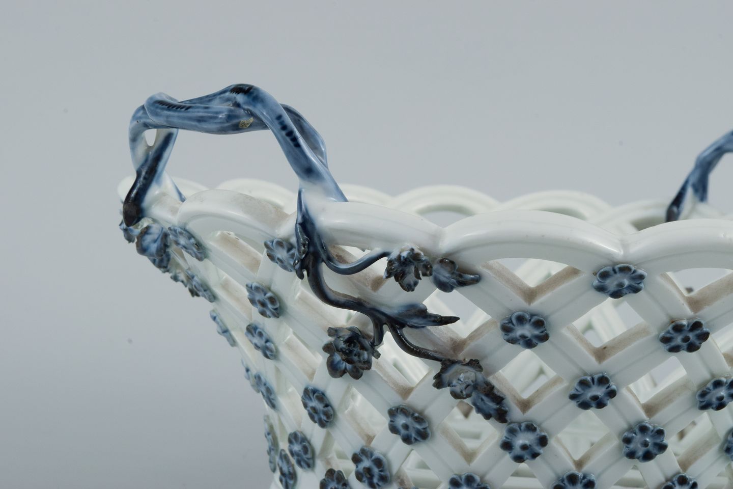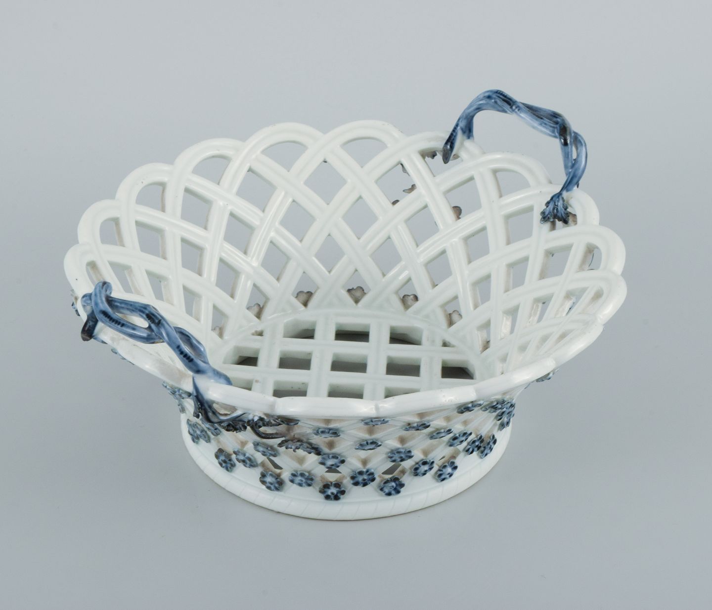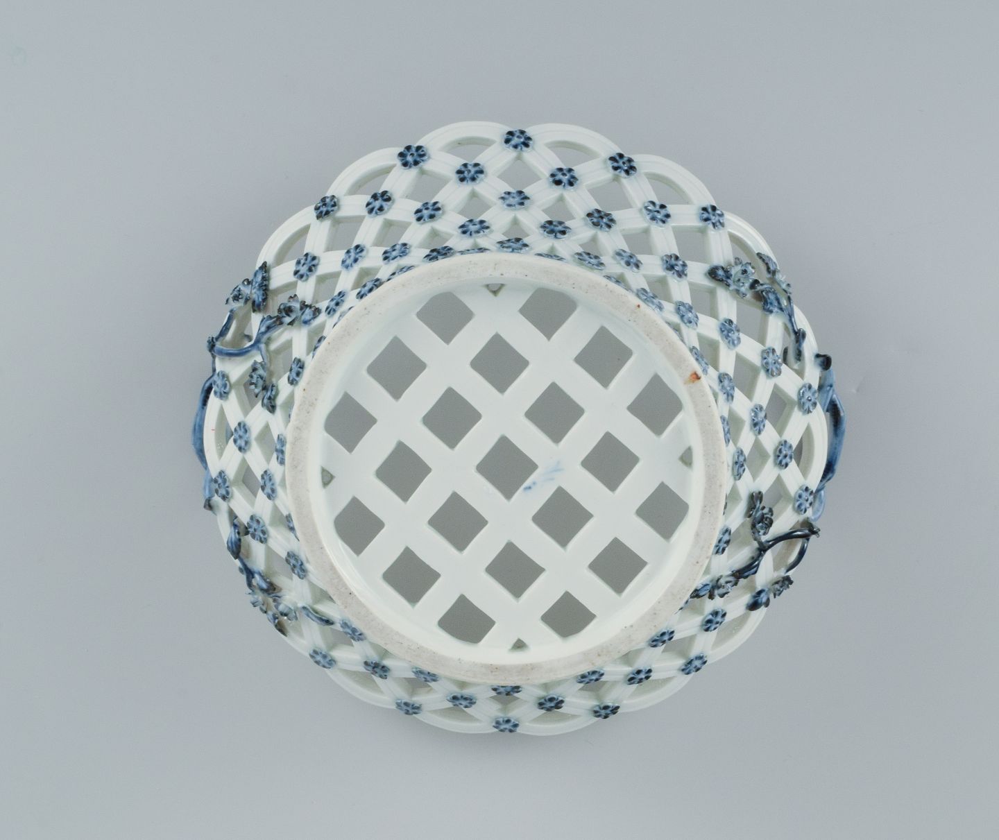 Meissen, Tyskland. Sjælden og tidligt Meissen skål med gennembrudt kant, hanke i form af grene og bladværk. Pousserende blomster i relief.