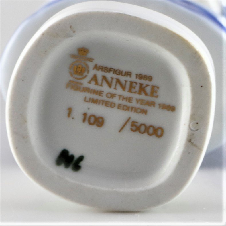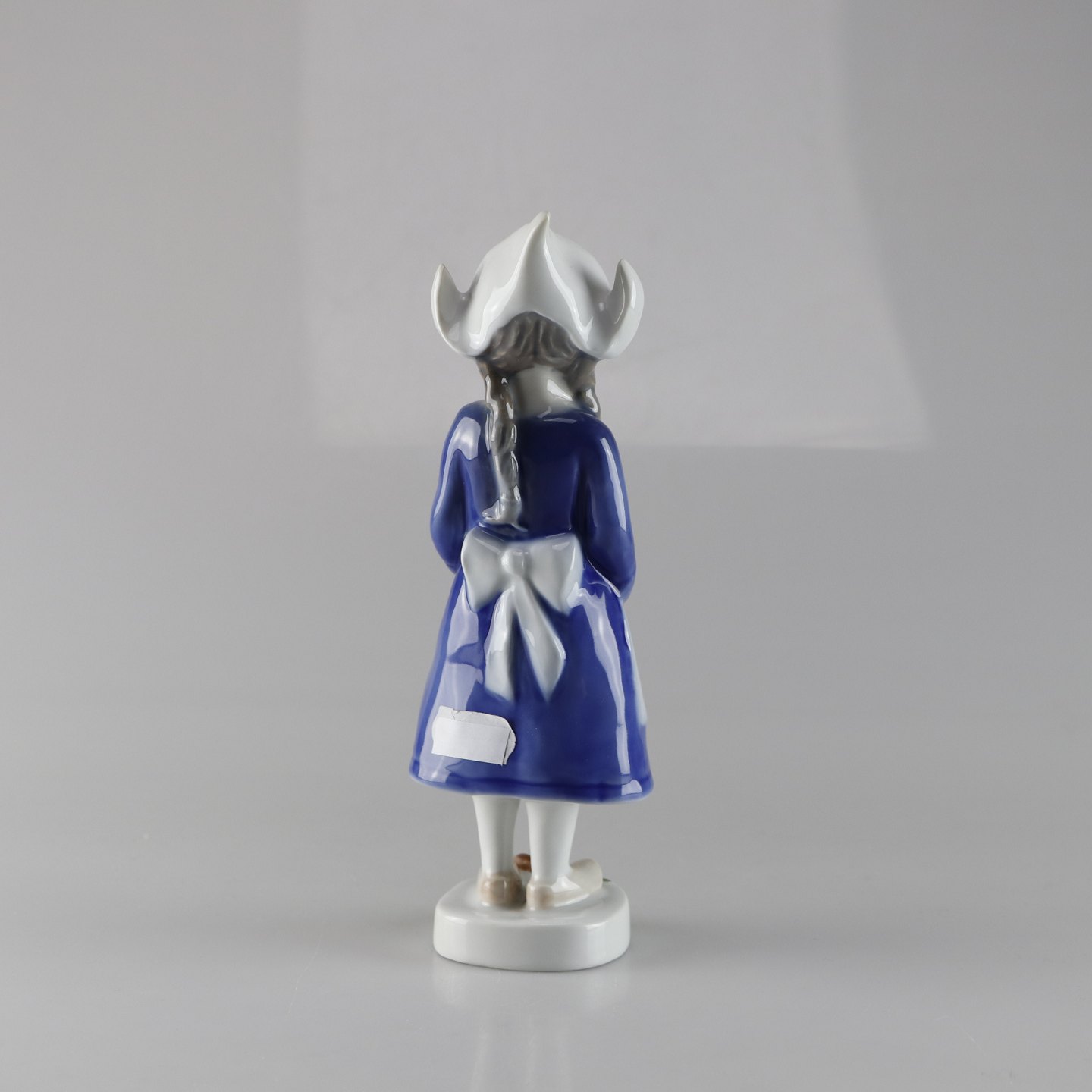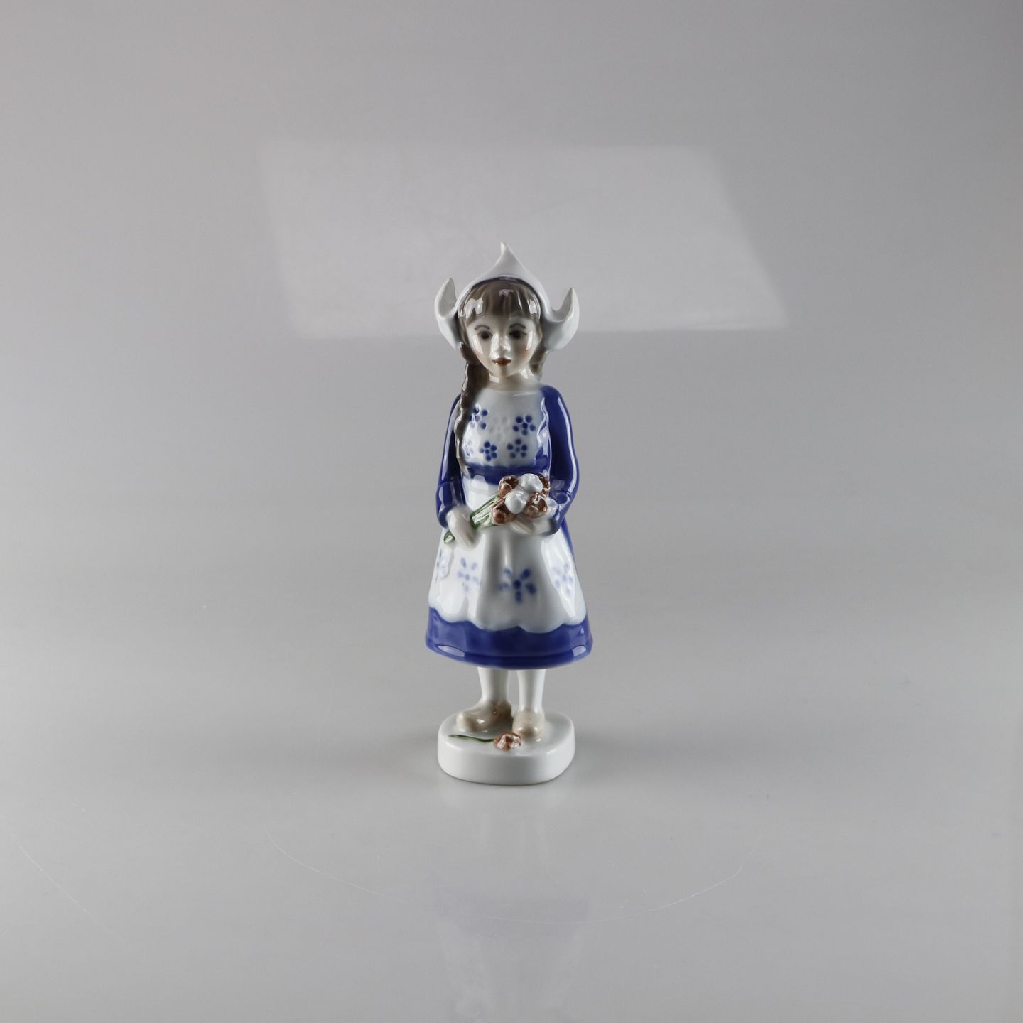 Porcelænsfigur med motiv af pige iklædt egnsdragt med buket blomster i hånden.