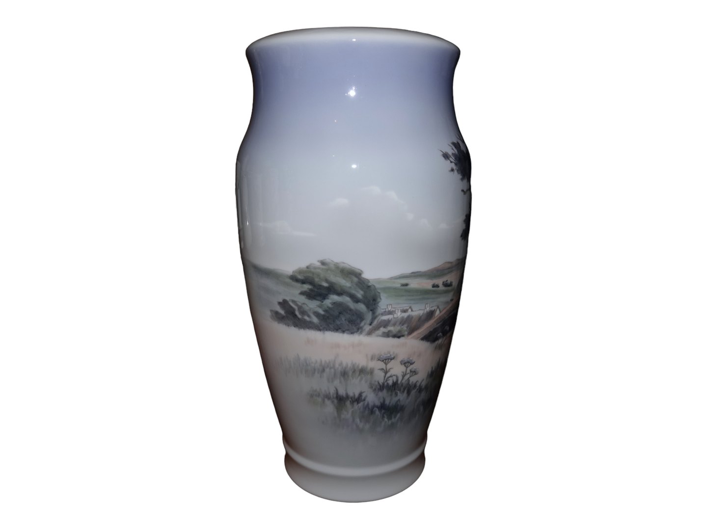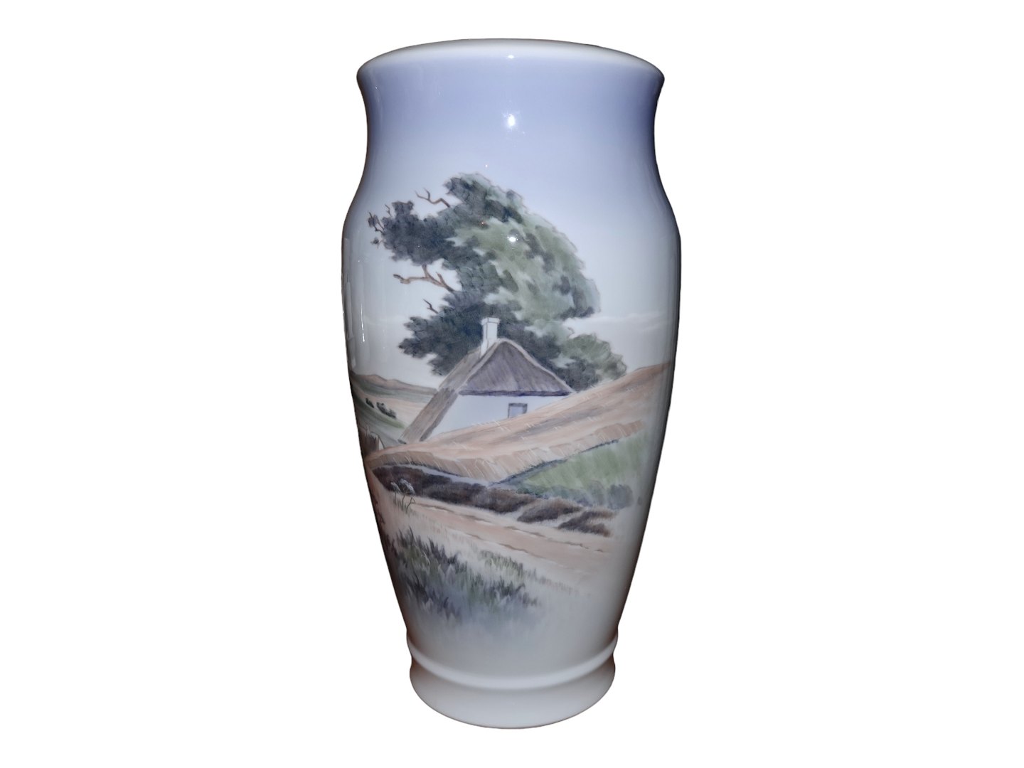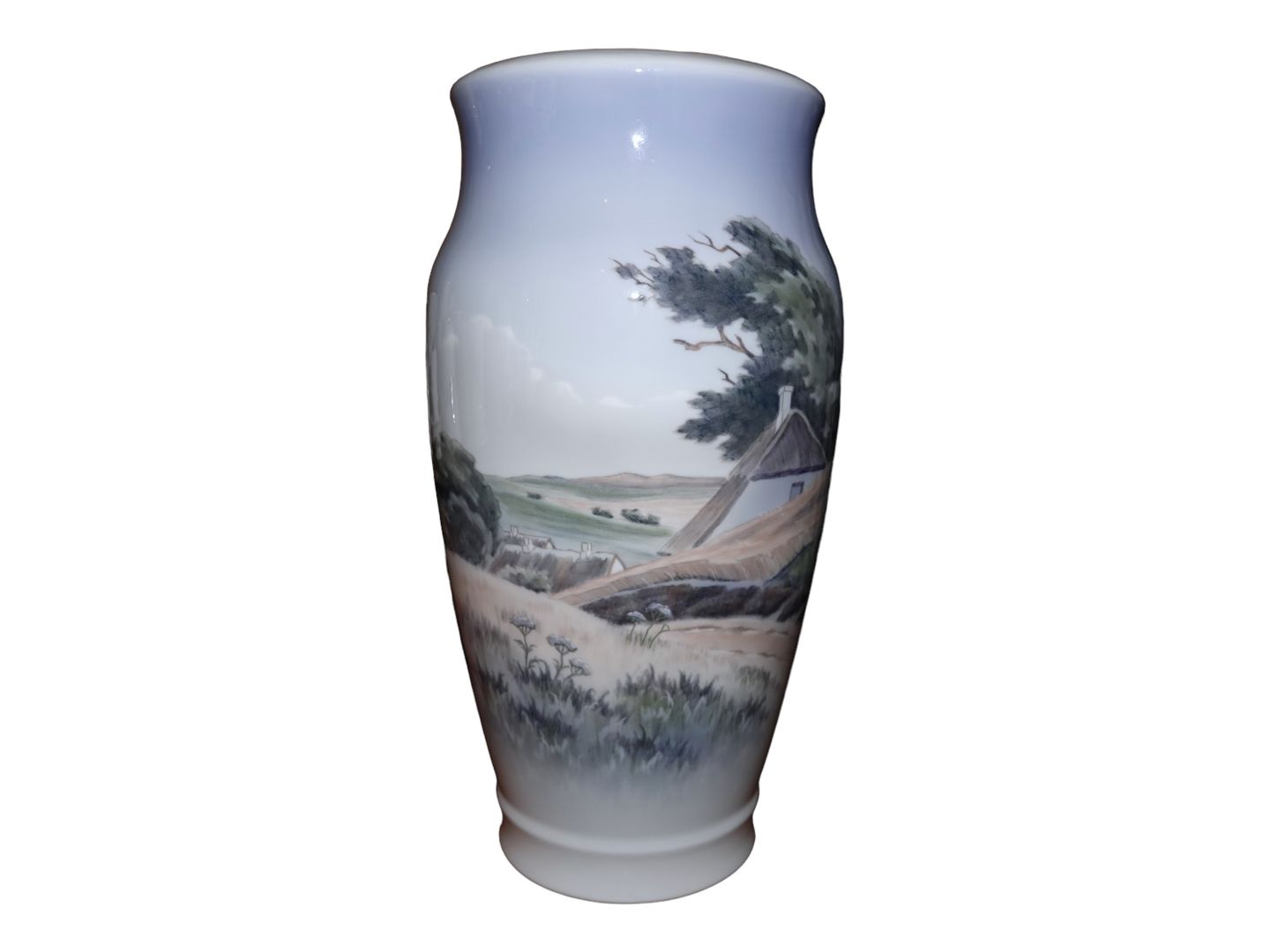 Stor Royal Copenhagen vase med stråtækte bondegårde og korn på marken.