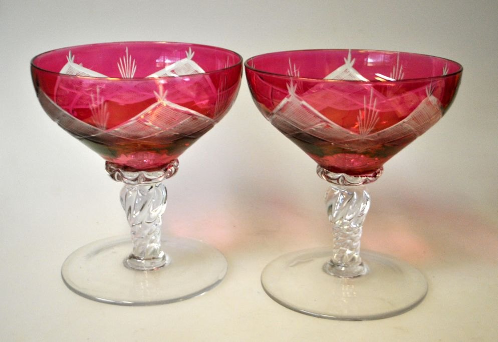 Champagne basin in crystal, 20th century Bohemia. Twisted foot. Basin with red cover glass and grinding. H.: 11 cm. Dia.: 10 cm.