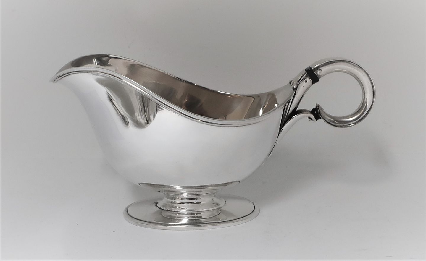 Grann & Laglye. Sølv sovsenæb / sovseskål (830). Længde 20 cm. Produceret 1933.
