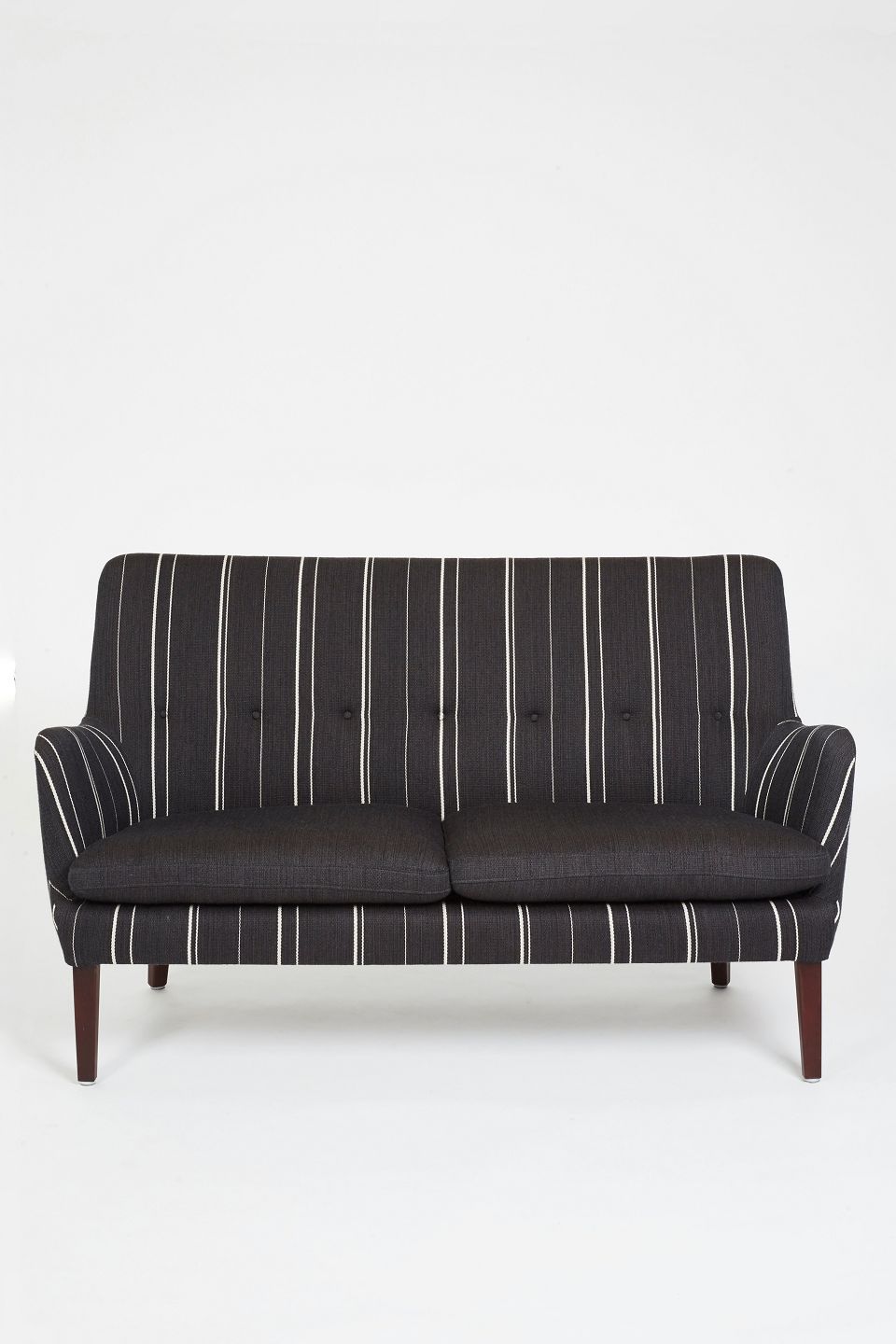 Arne Vodder. Topersoners sofa model AV53,betrukket med sort og hvidstribede savak og ben i mørkt træ.Løse sædehynder med dunfyld.