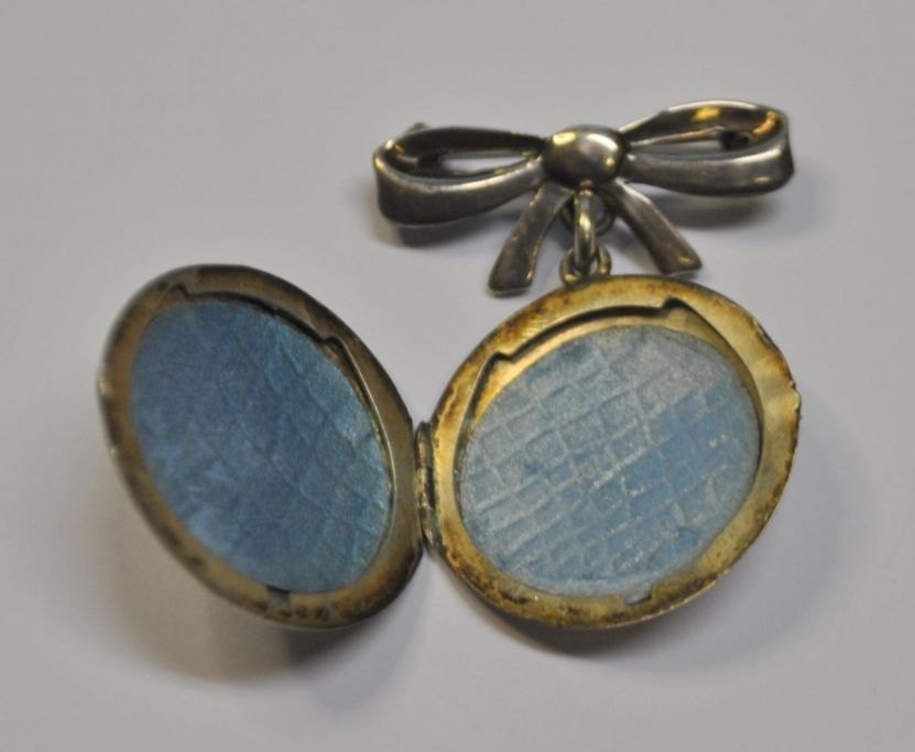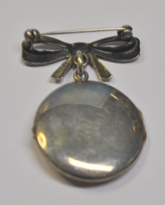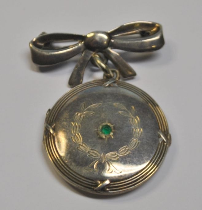 Sølv foto gemme som brosche, C. C. Olsen, København (1893 - 1910) Danmark. Medaljon i sløjfe.Med gravure og grøn glassten. Stemplet. 4,5 x 3,5 cm.