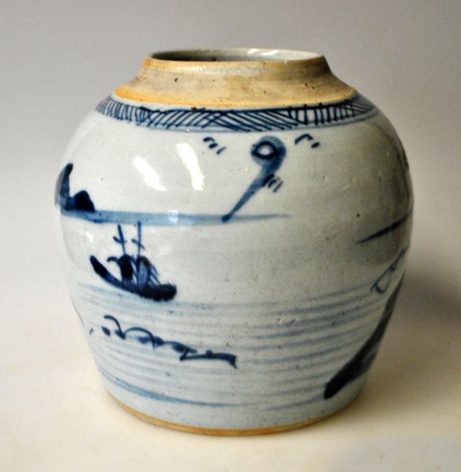Blå/hvid kinesisk bojan, 19. årh. Uden låg. Dekoreret med landskab, bjerge, skib og fiskende. H.: 15 cm.