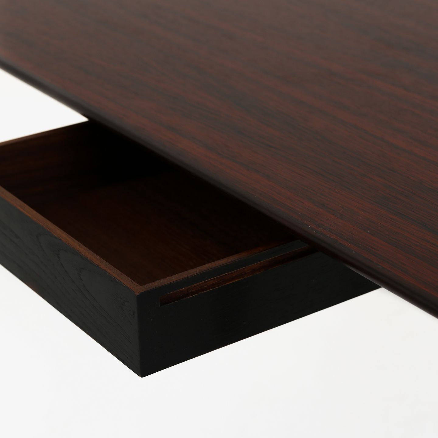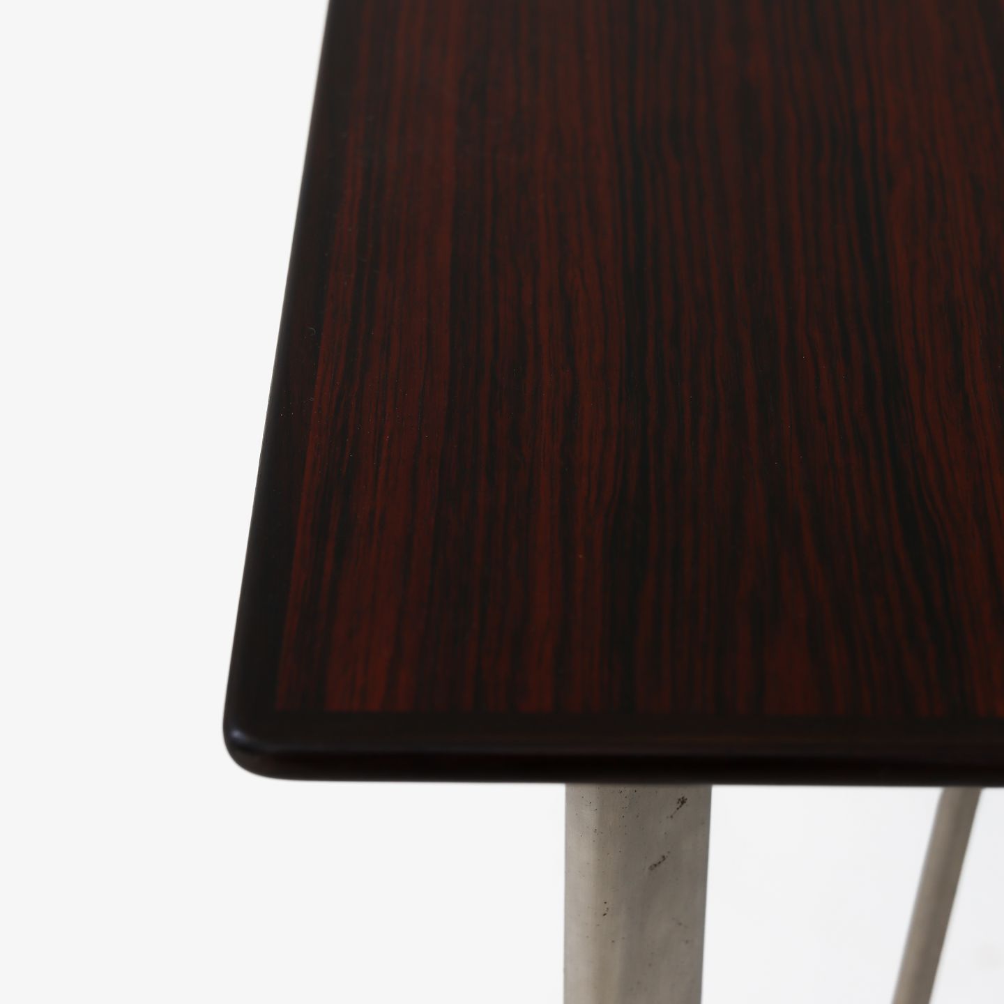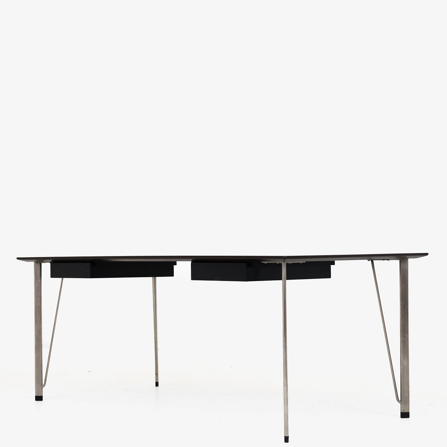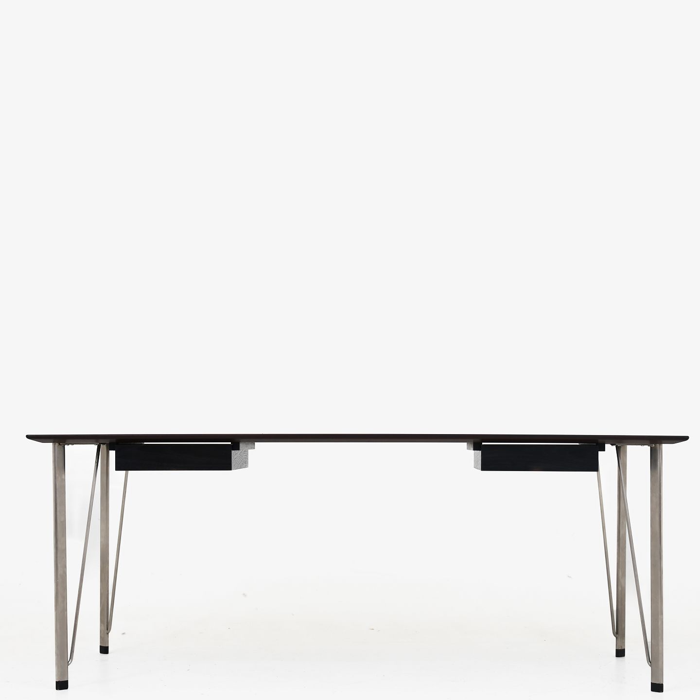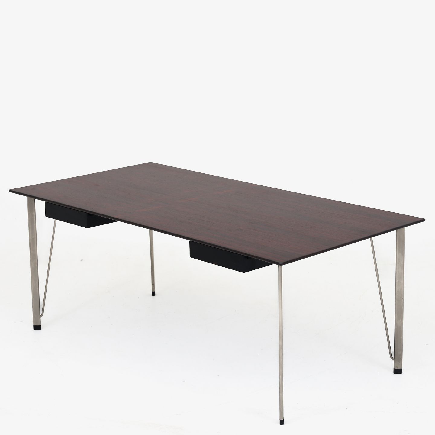 Skrivebord i palisander med skuffer af sortlakerede skuffer, ben af forkromet stål og sko af massiv palisander.