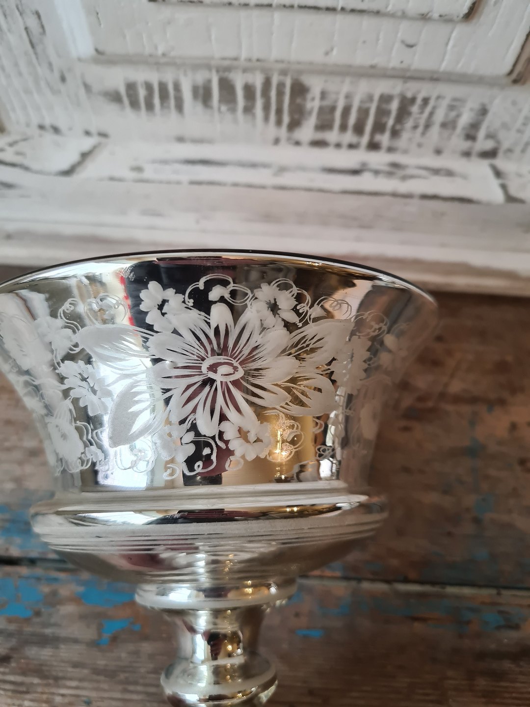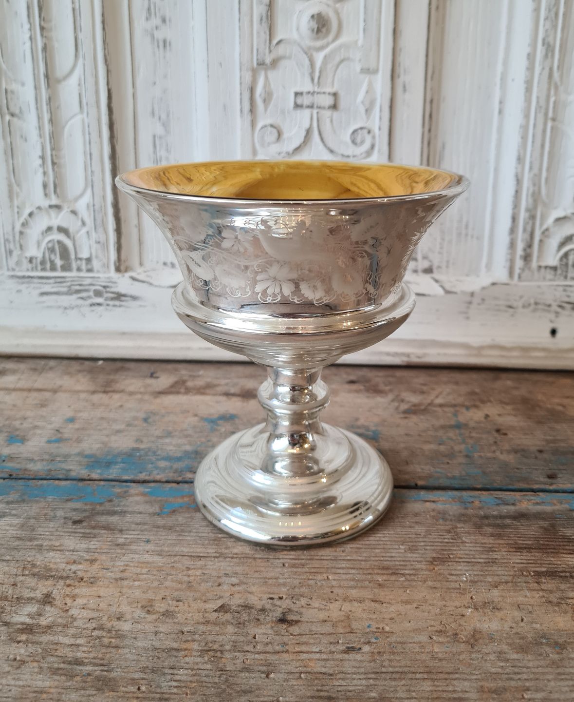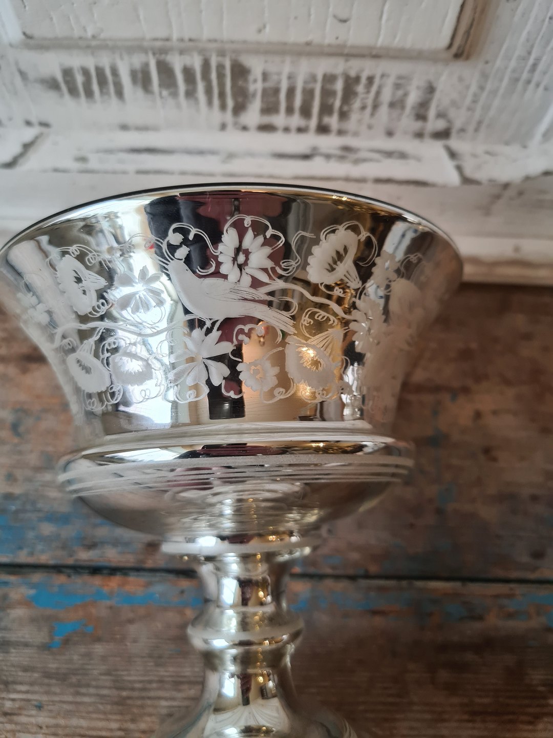 19th century candy bowl in mercuri silver, finely decorated with flowers and birds.