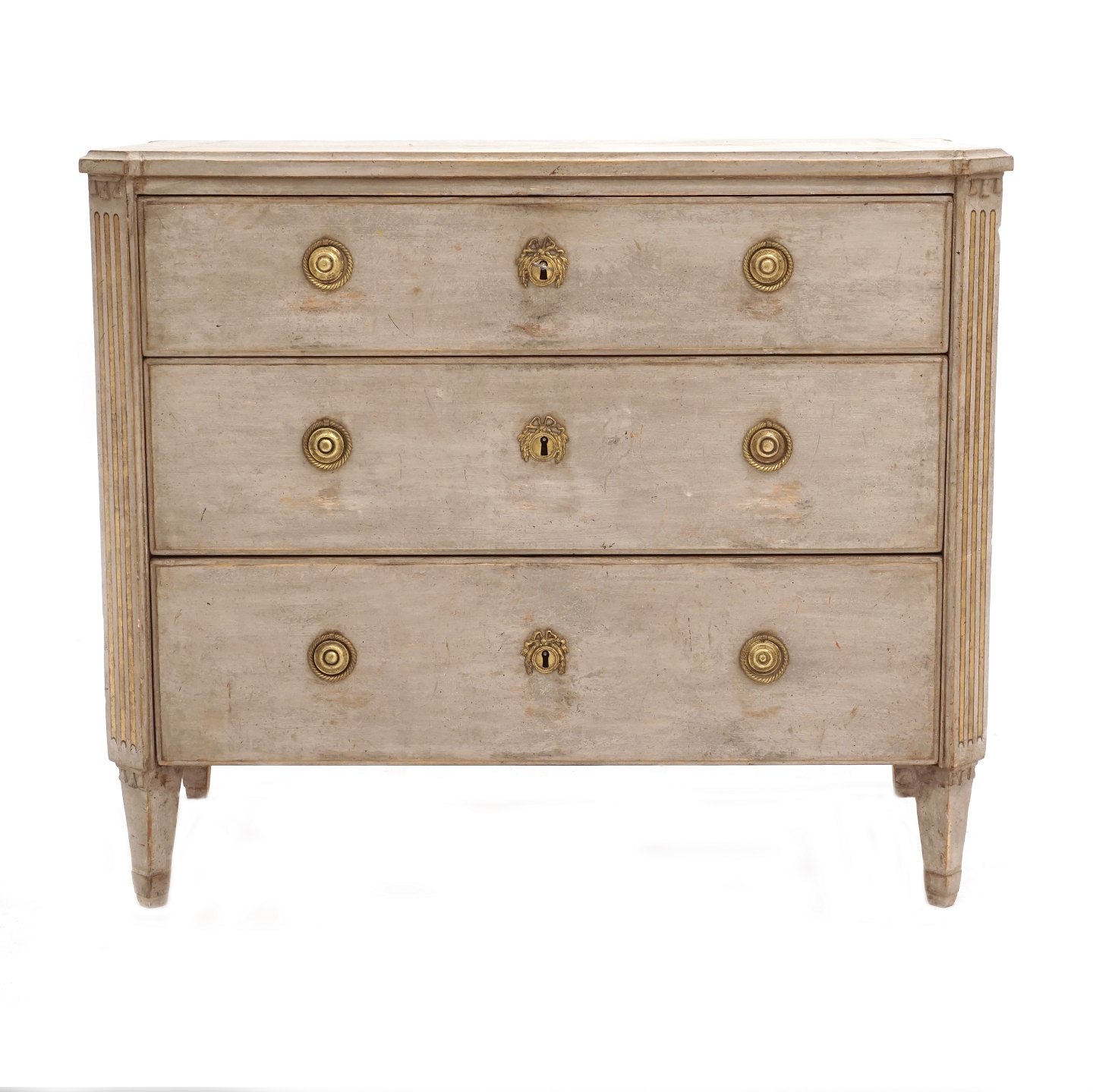 Gustavian chest of drawers with gilt canted fluted side posts. Sweden circa 1780. H: 84cm. Top: 99x54cm