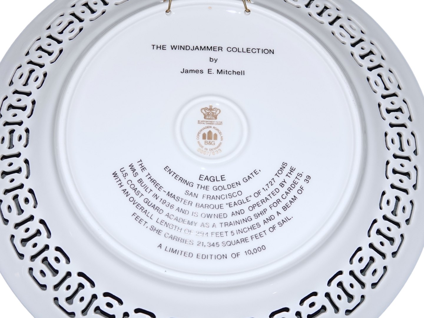 Bing & Grondahl, large Windjammer plate with sail ships, Eagle at Golden Gate in San Fransisco.