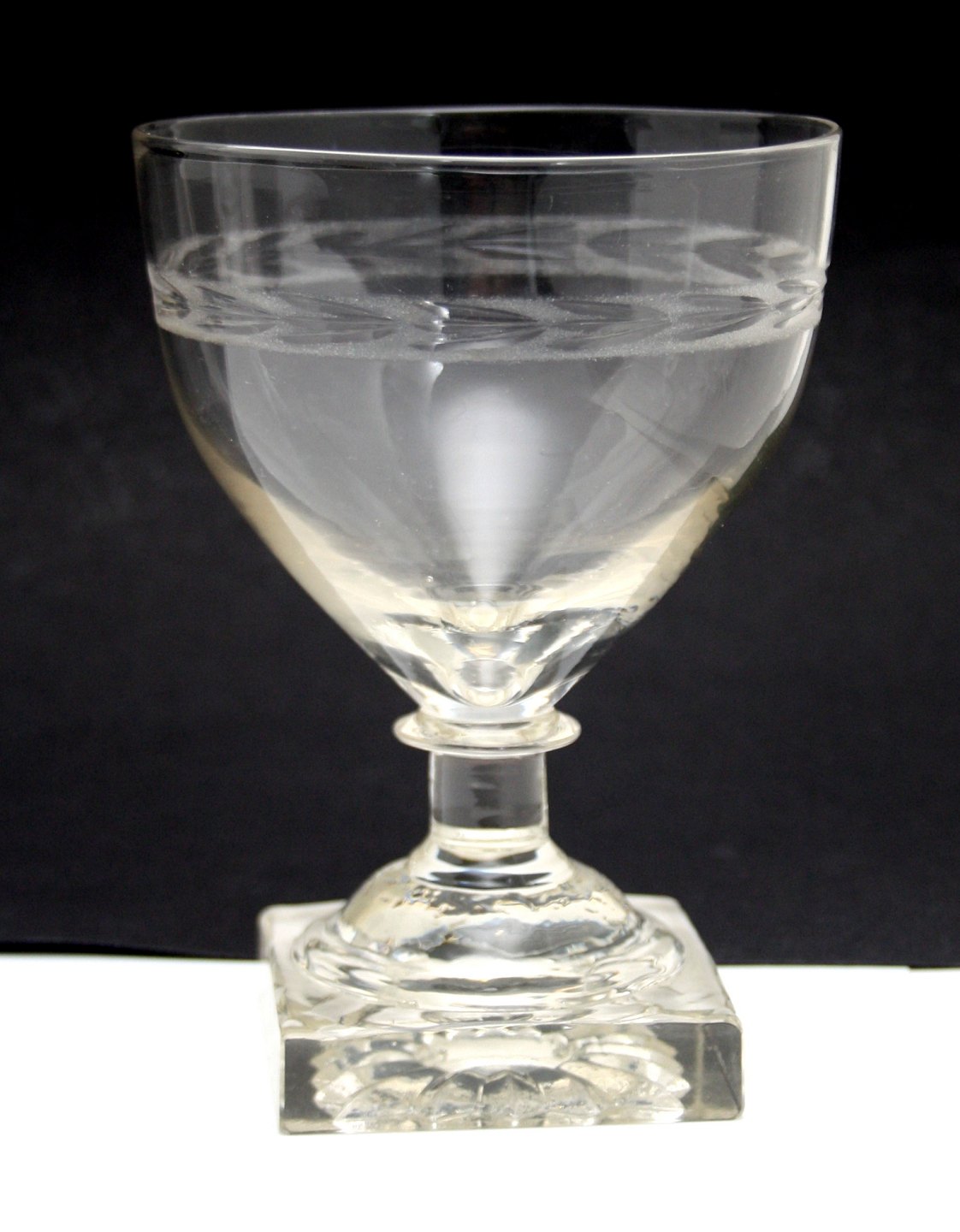 Kastrup glasværk, Emma slibning med kraftig firkantet slebet fod. Bunden har opstukket "blomst" med spidse kronblade. Produceret fra ca. 1910-1950. Holmegaard har produceret lignende glas som Gorm den Gamle uden slibning og med runde kronblade. Planslebet øverst på fod. Rødvin. Højde 13 cm. Diameter 9 cm. Større afslag i bunden af fod. Pris: 300 kr. stk. Lager: 4