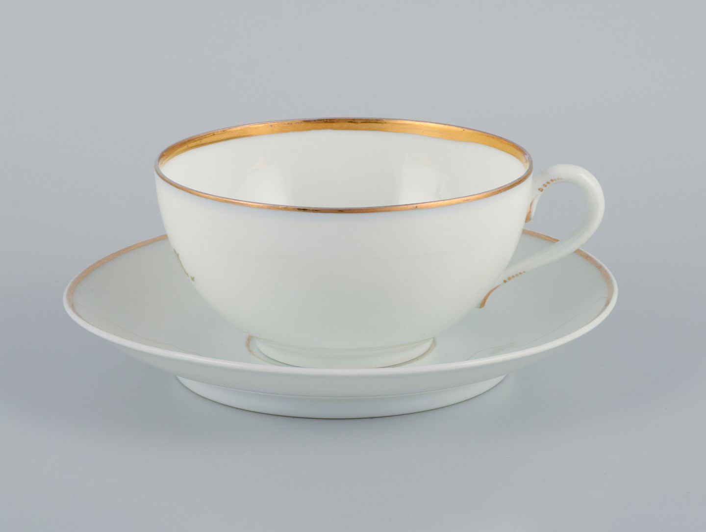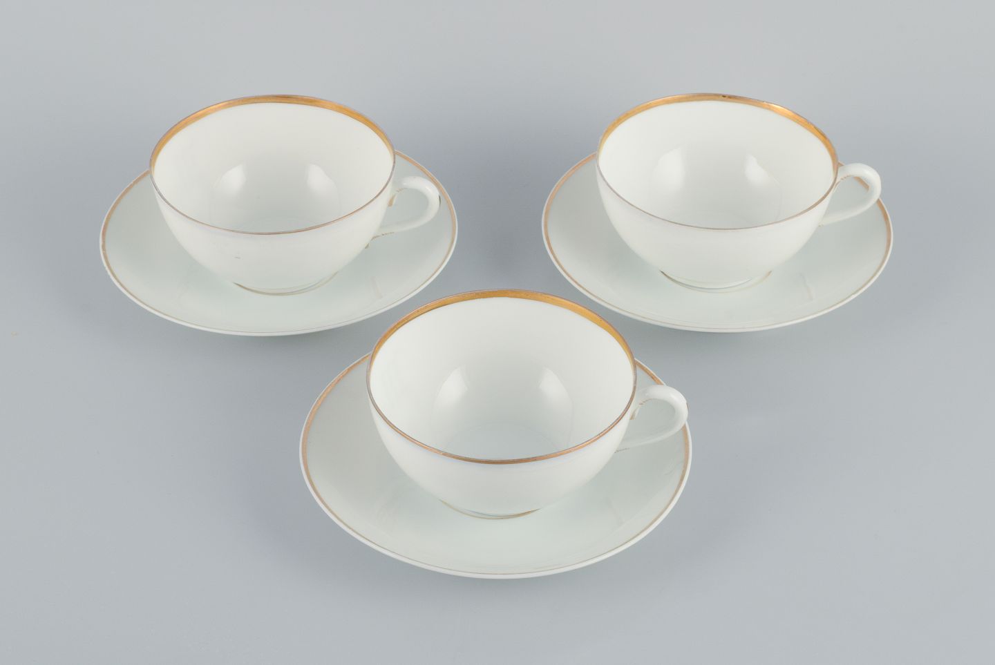 Rosenthal, Germany, a set of three large teacups and matching porcelain saucers. Thin white porcelain with gold decoration.