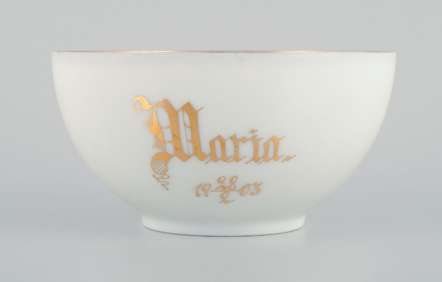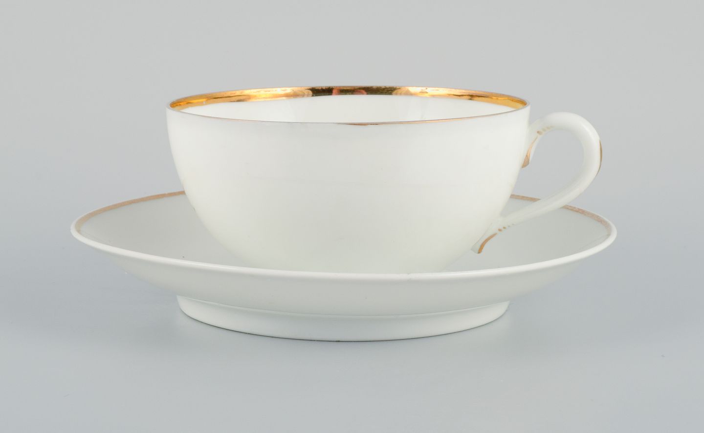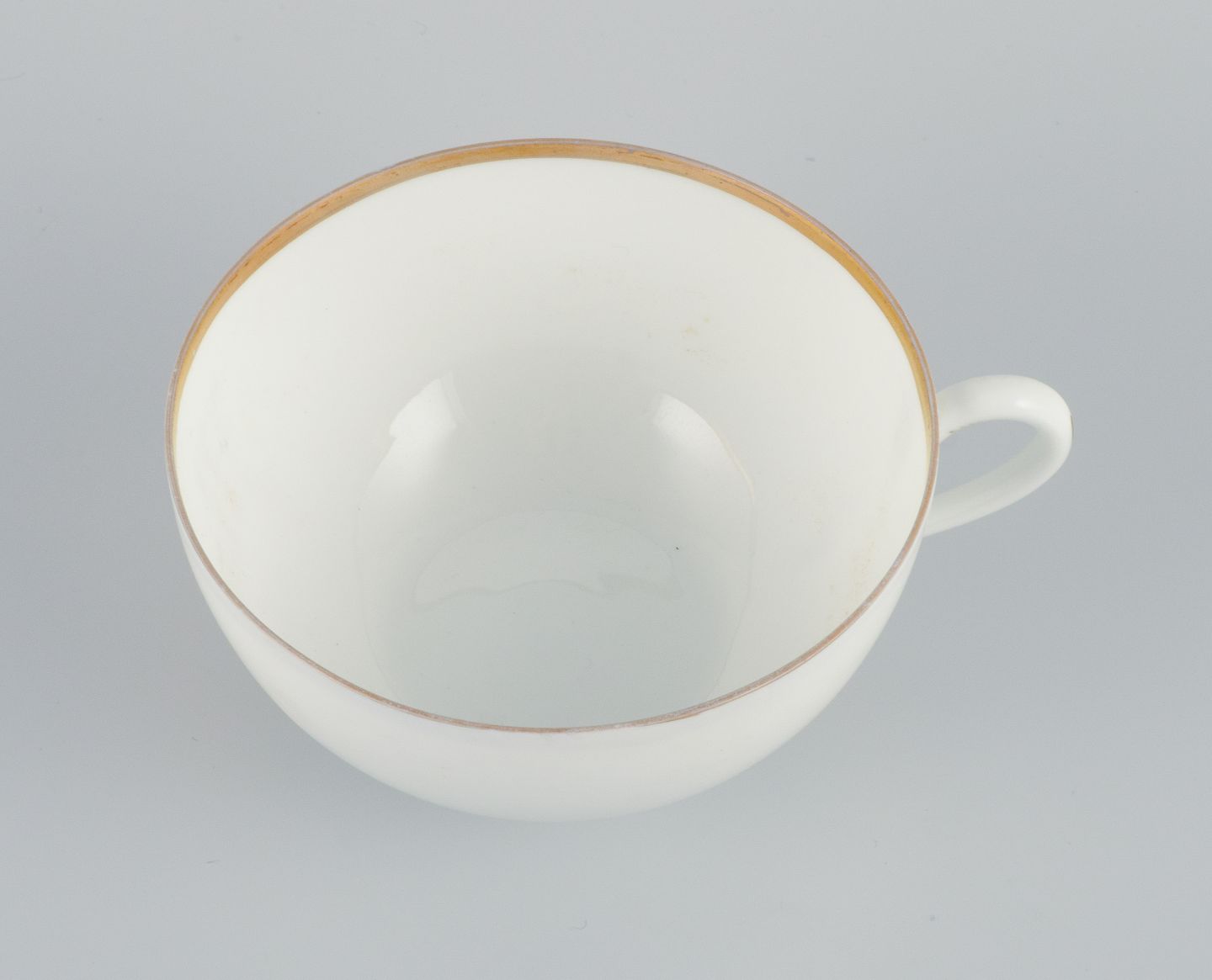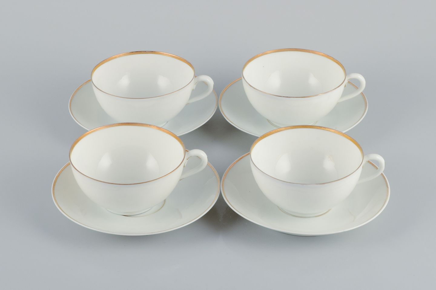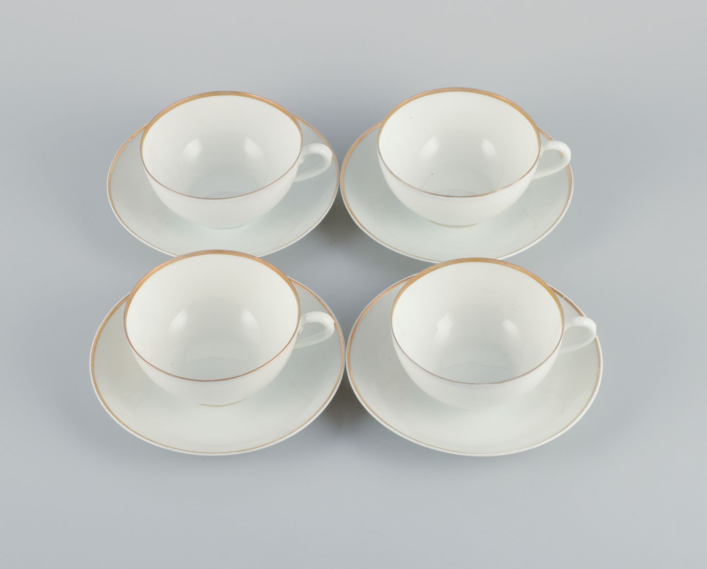 Rosenthal, Tyskland, et sæt på fire store tekopper med tilhørende underkopper i porcelæn. Tyndt hvidt porcelæn med gulddekoration.