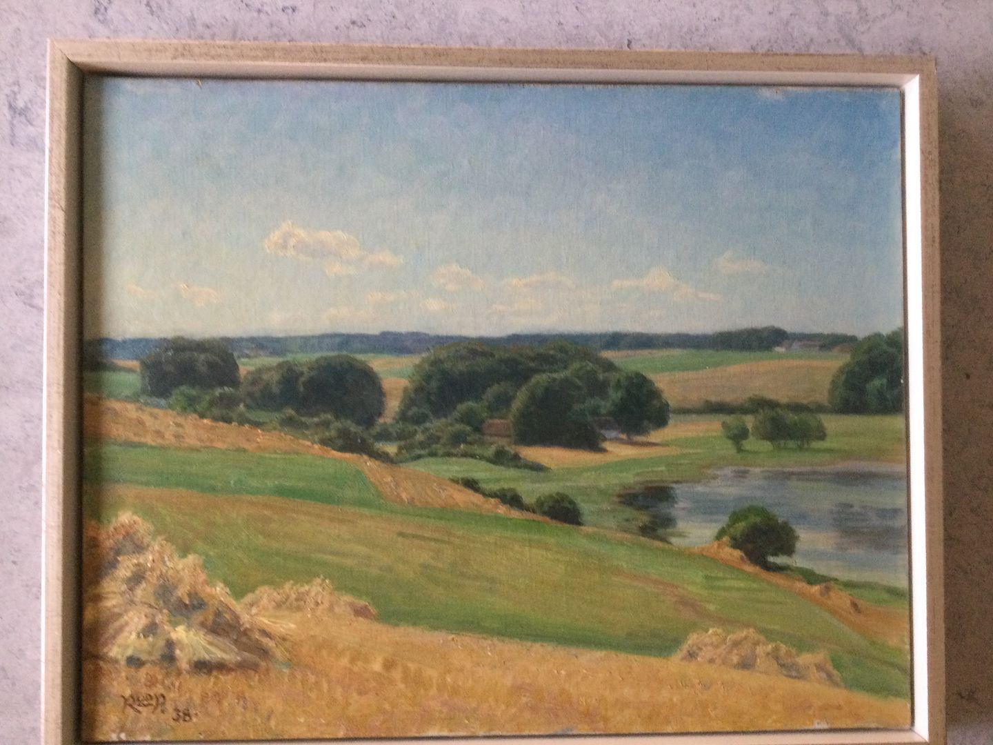 Maleri af Rud-Petersen - Gård i landskab 1938.