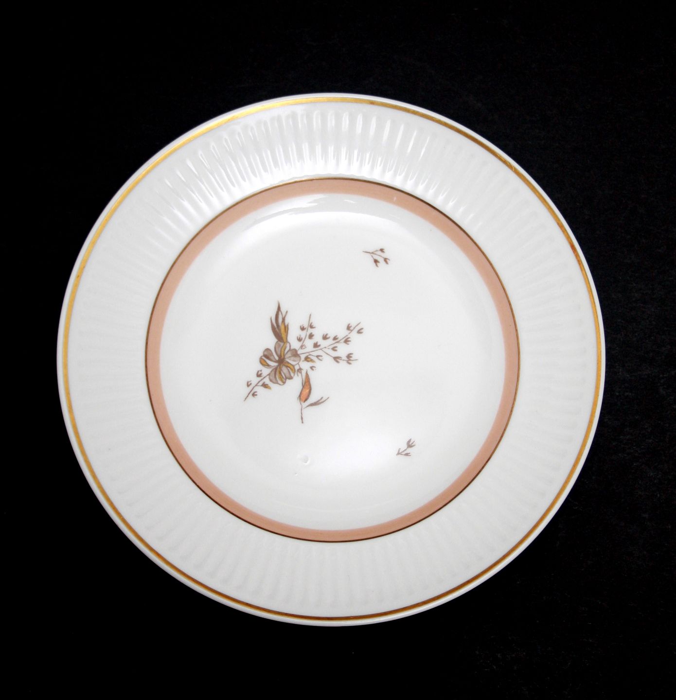 Royal Copenhagen, Clarissa. Designet af Thorkild Olsen i 1950'erne. Hvidt riflet stel med guld- og rosa/beige kanter, samt blomstermotiv i guld. Kagetallerken. Nr. 1510/14060. Diameter 15 cm. II. sortering. Fin stand. Pris: 40 kr. stk. Lager: 20