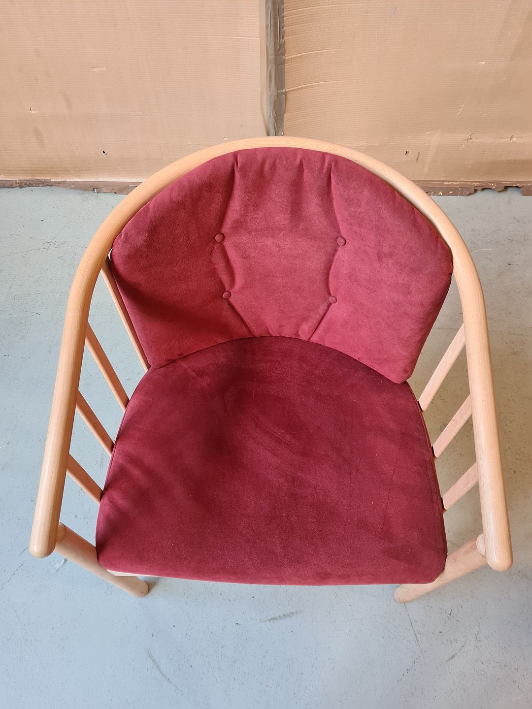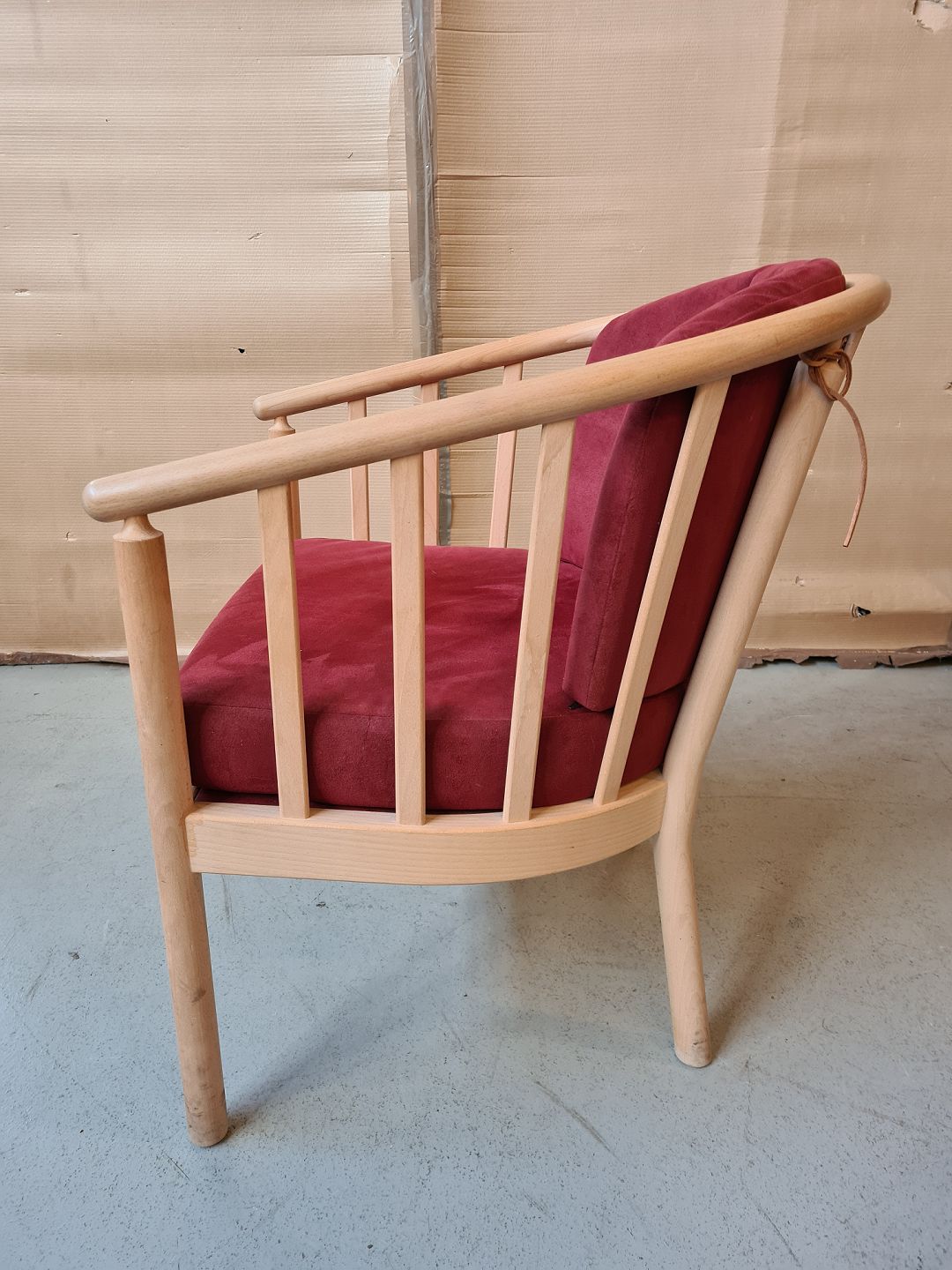 Lænestol i massivt bøgetræ med hynder af kunst ruskind, fra 2000erne.