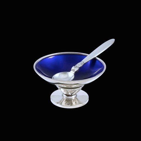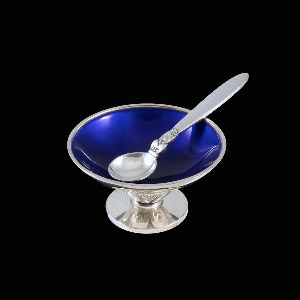 Georg Jensen. Sterling Silver Salt Cellar with Enamel and Spoon - Cactus #629