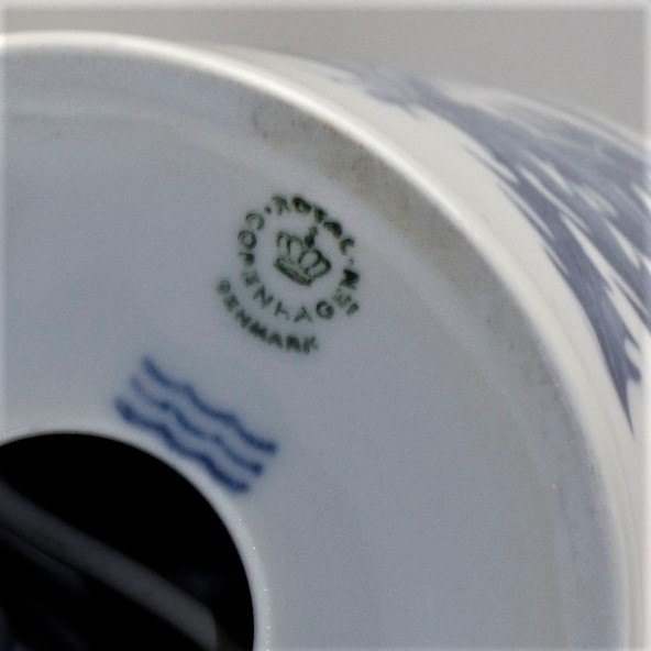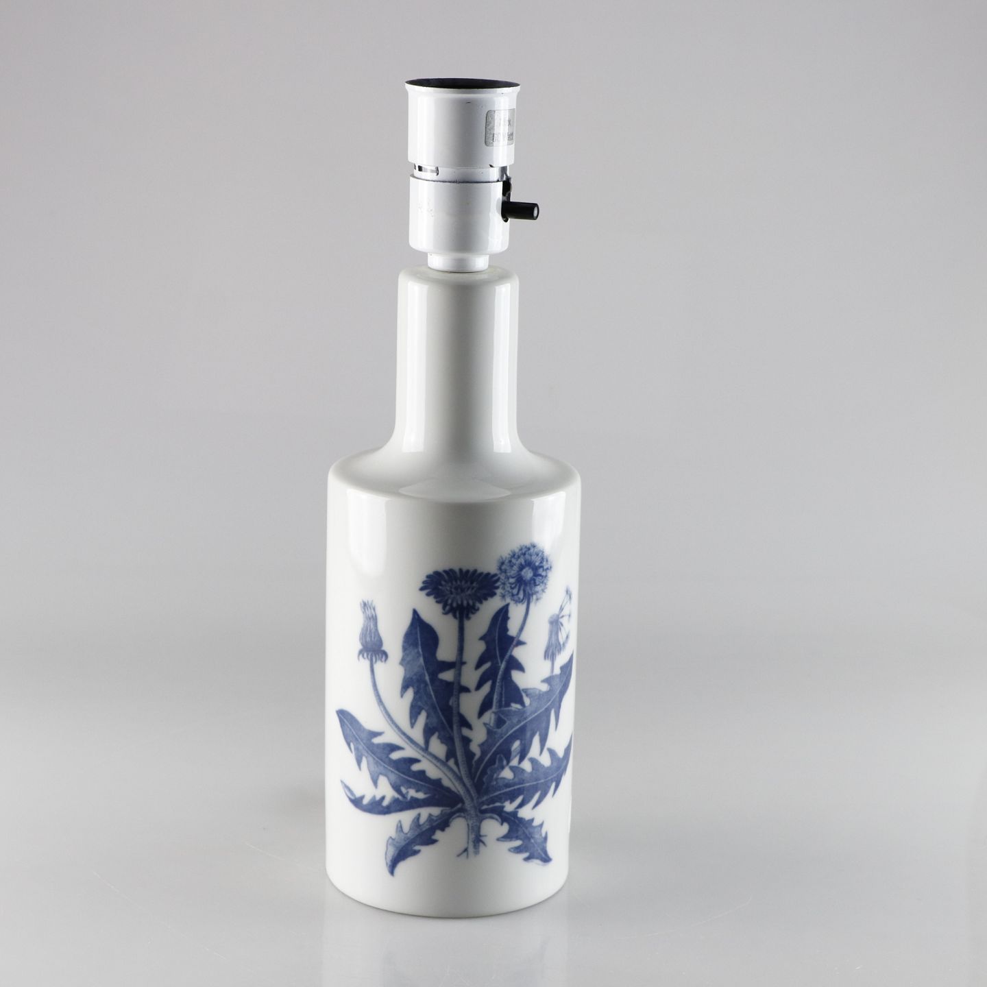 Lampefoden i hvid porcelæn dekoreret med en mælkebøtte i blå farver