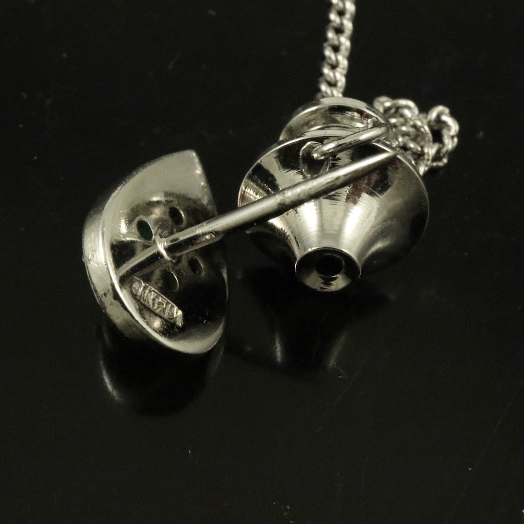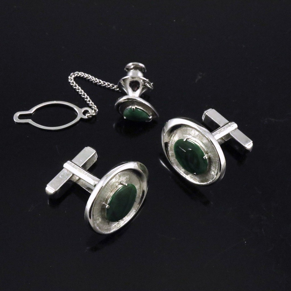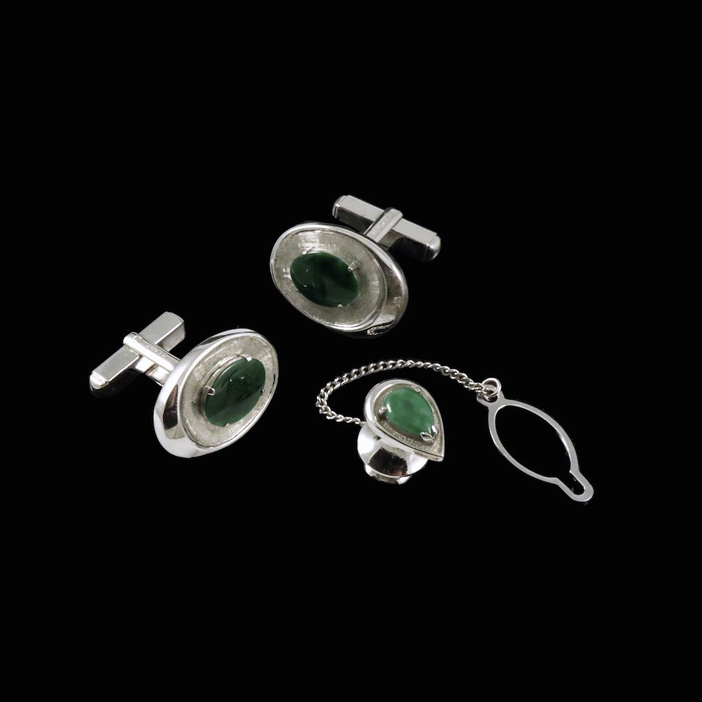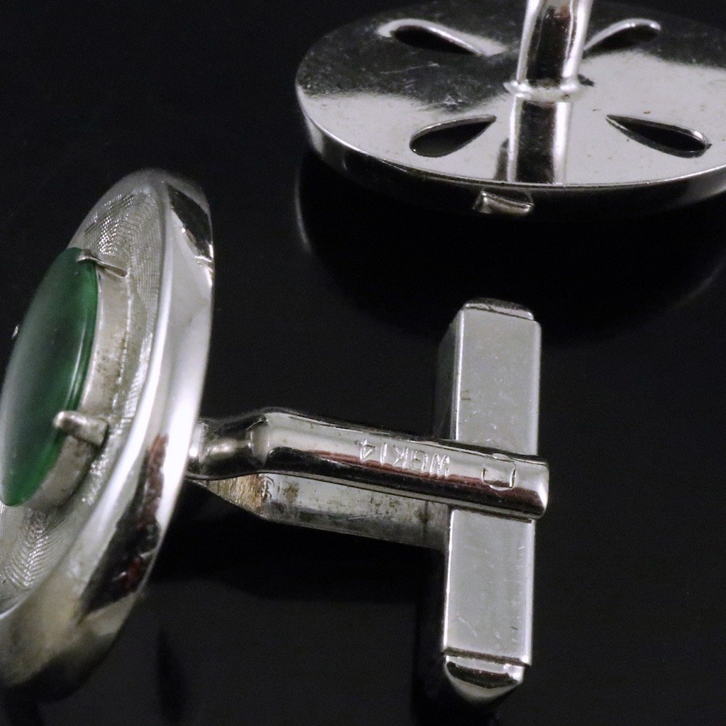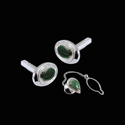 Manchetknapper og reversnål / Lapel Pin i 14k hvidguld med jade.