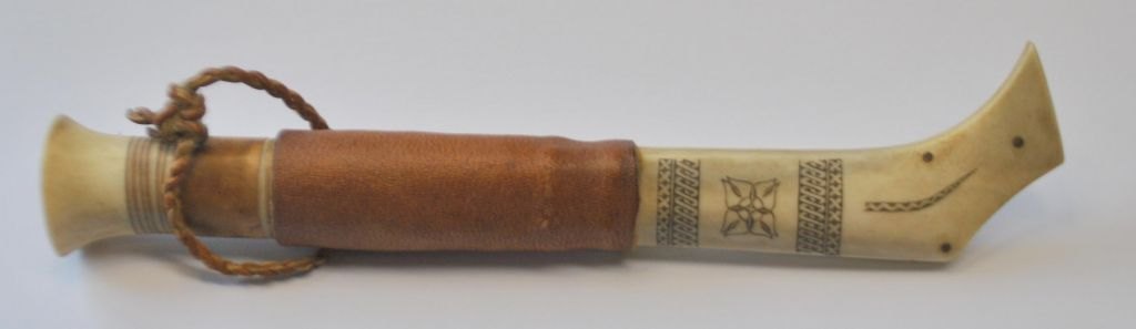 Norsk samekniv, 20. årh. Udformet i rensdyrtak med dekorationer. Indlægninger af birketræ. Med læderophæng.Signeret.: CA. L.: 21,5 cm.