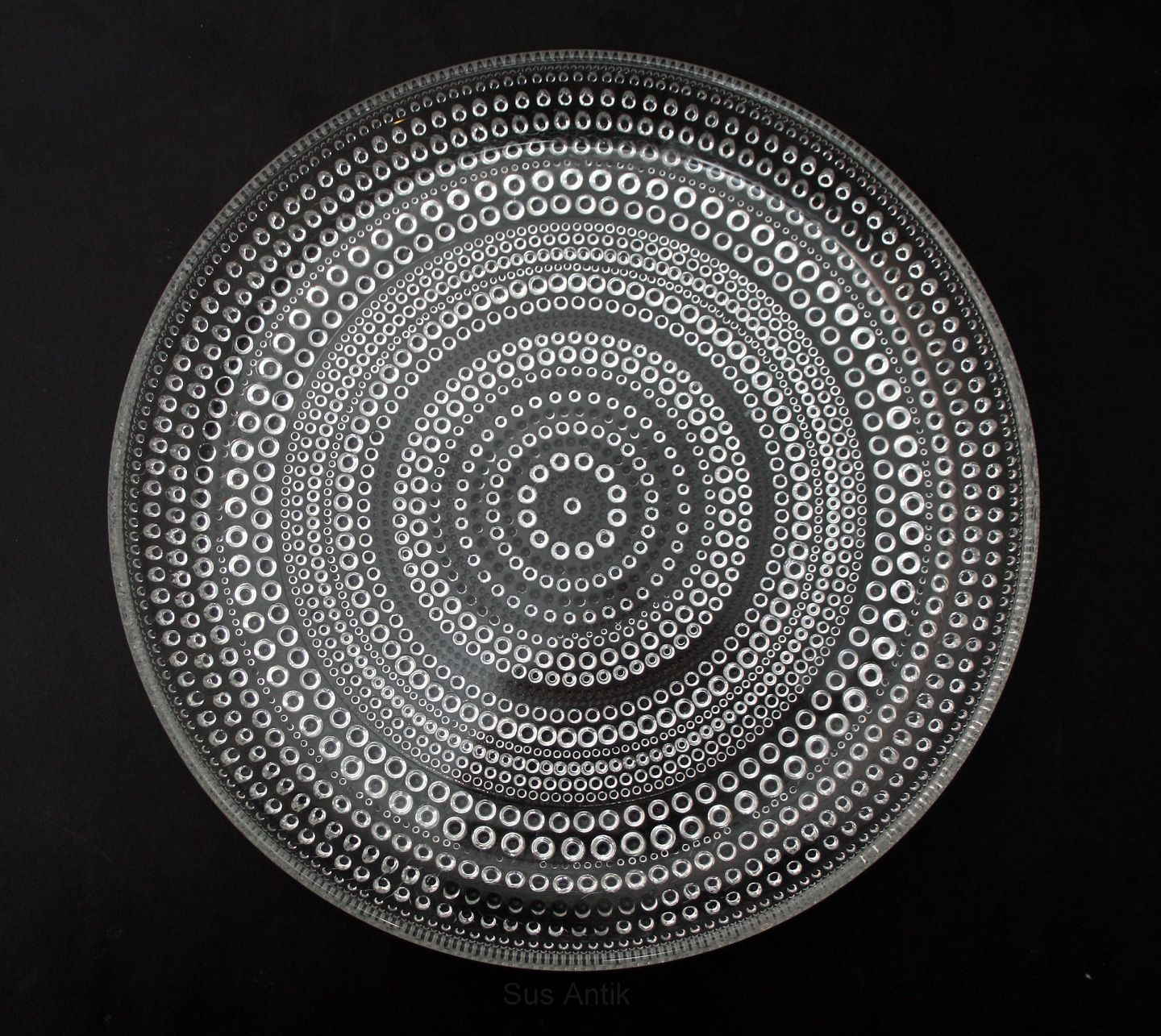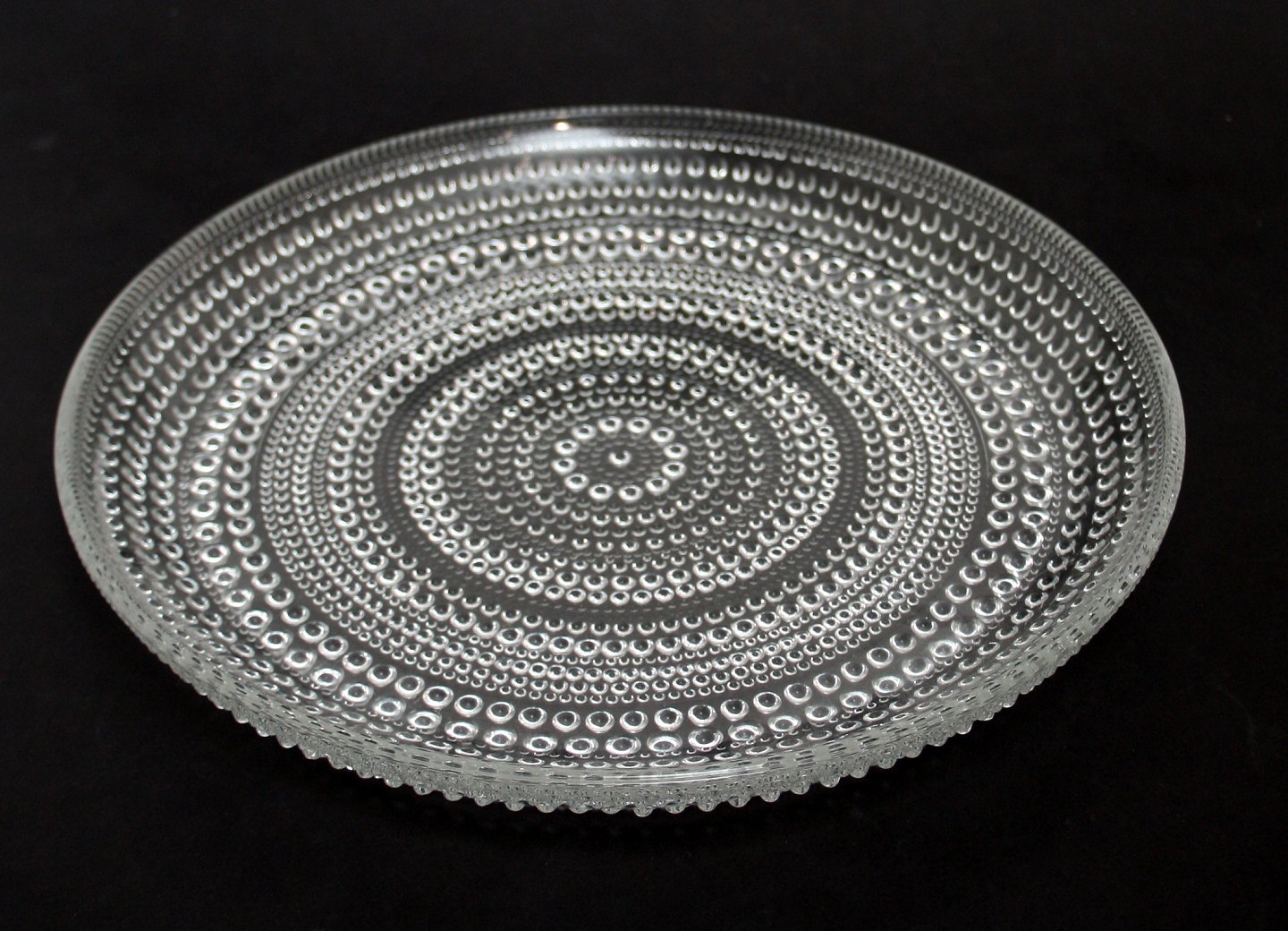 Iittala, Finland. Kastehelmi, Flad tallerken, fad. Designet af Oiva Toikka for Notsjö i 1964. Diameter 25 cm. Højde 2,7 cm. Pris: 150 kr. stk. Lager: 1