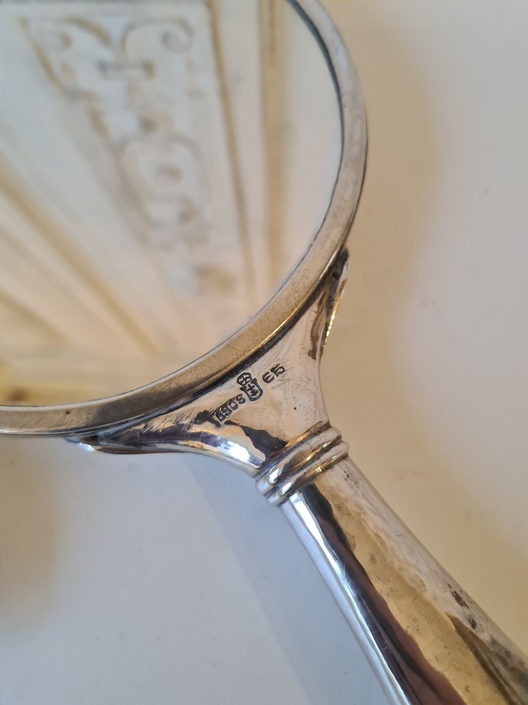 Skønvirke toiletgarniture af Emil Hansen - Odense. Sættet er produceret i sølv prydet med grønne sten - antageligt chrysopras