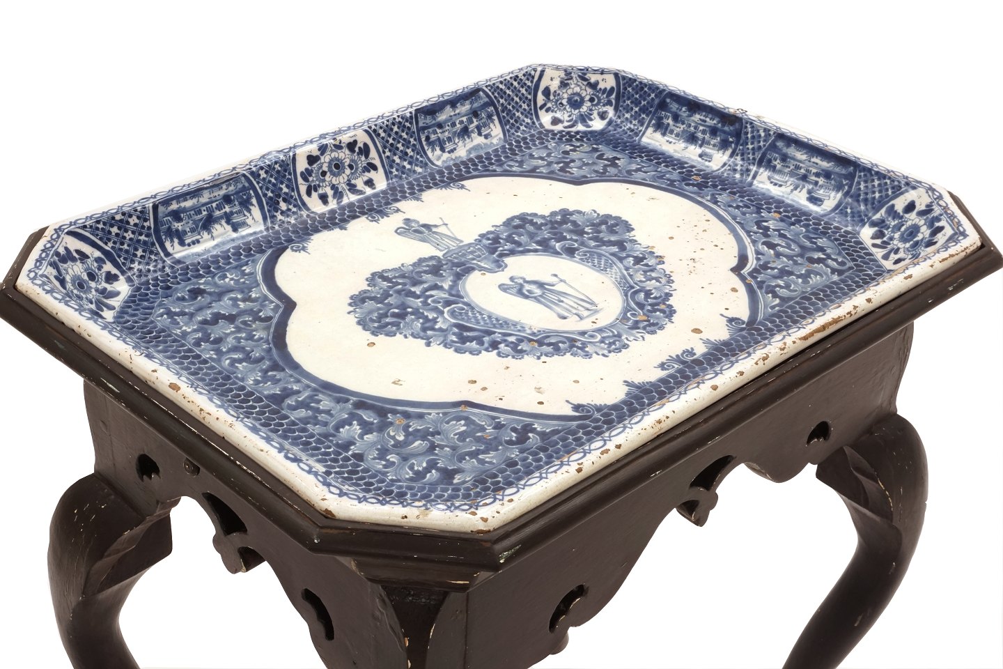Bakkebordsblad dekoreret i blå farver visende borgerligt våben flankeret af indrammede felter med akantusblade. Urestaureret.