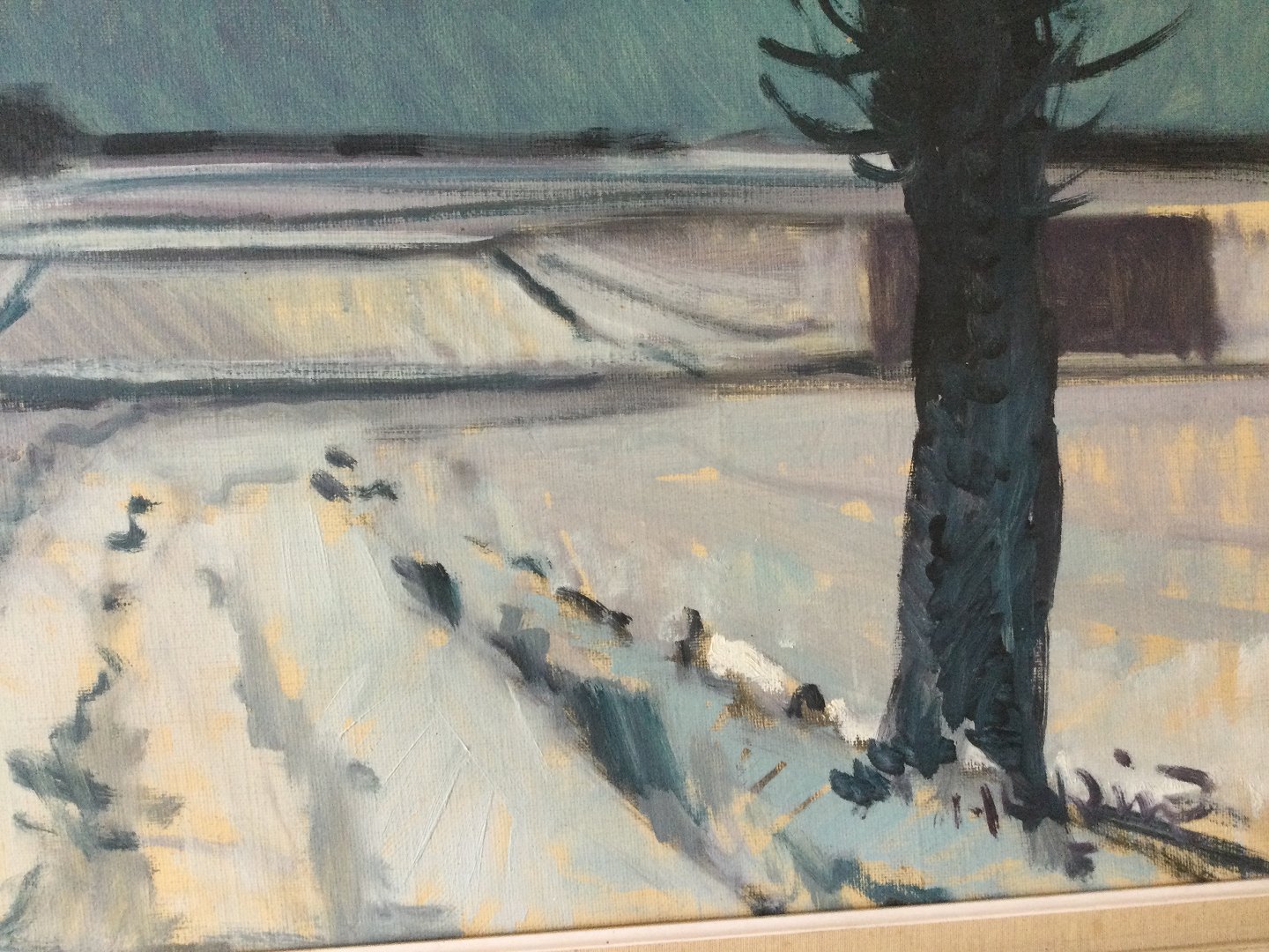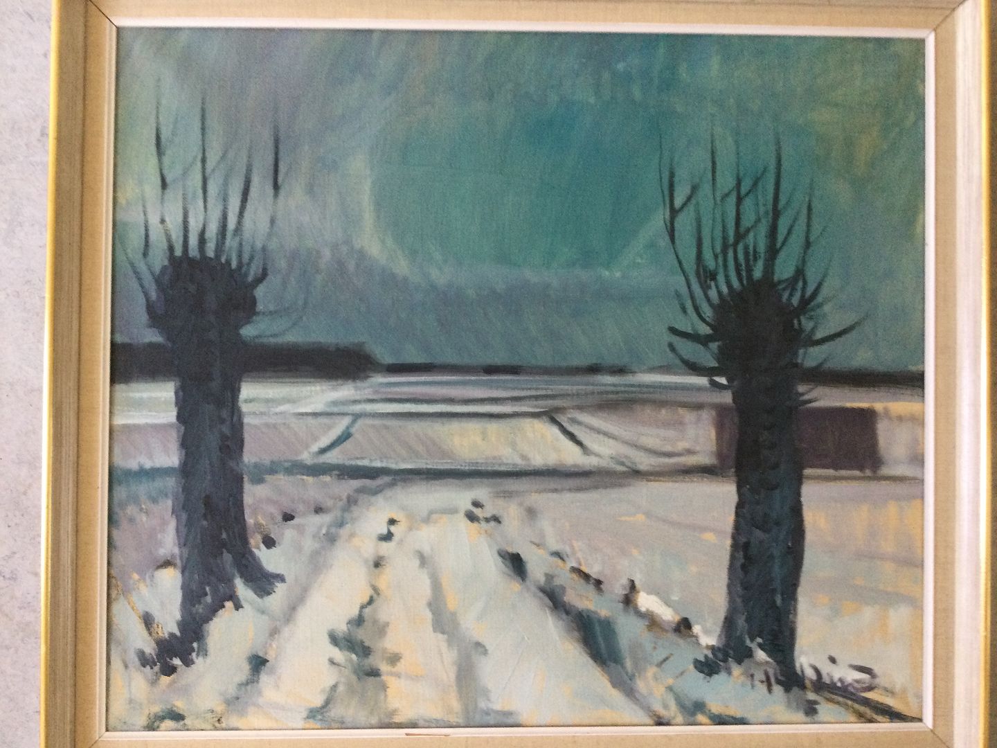 Maleri af Knud Horup - Vinterparti med vej og stynede træer.