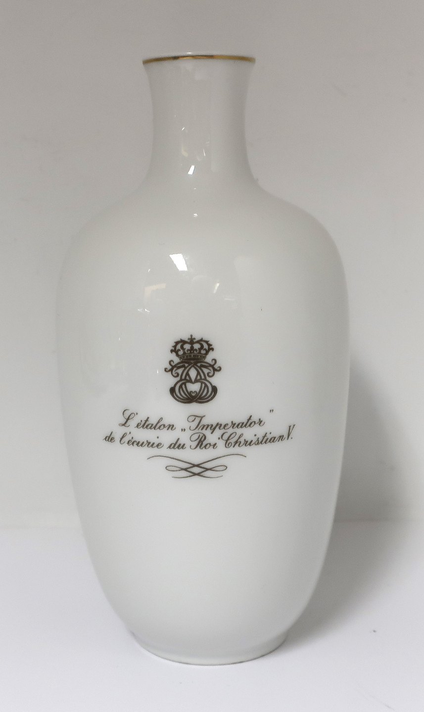 Royal Copenhagen. Vase med Christian d. 5 til hest. Højde 17,5 cm. (1 sortering)