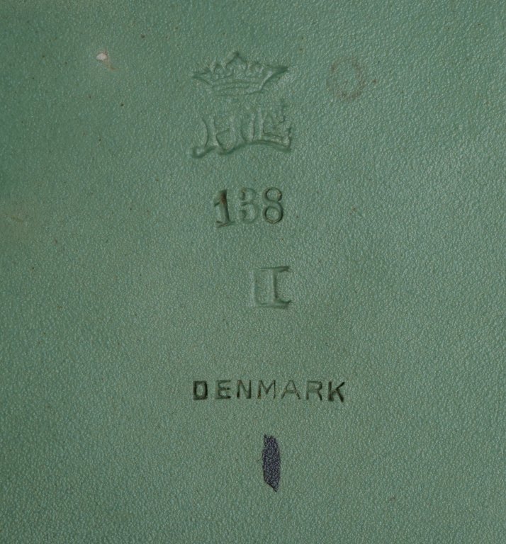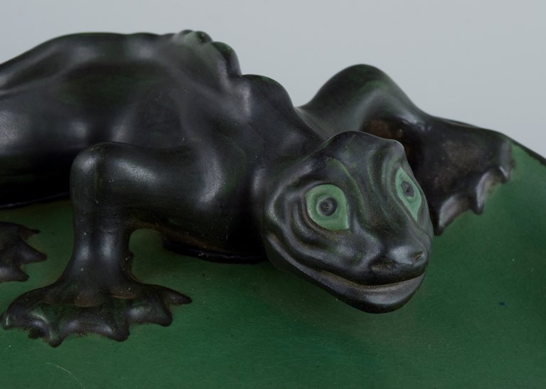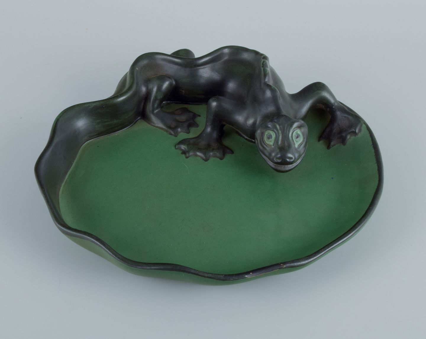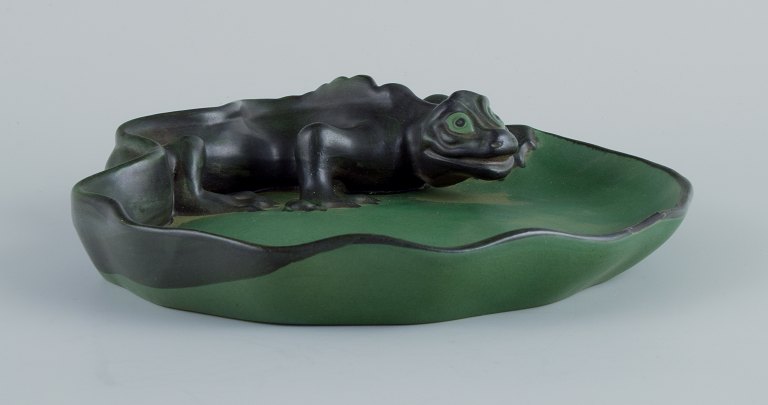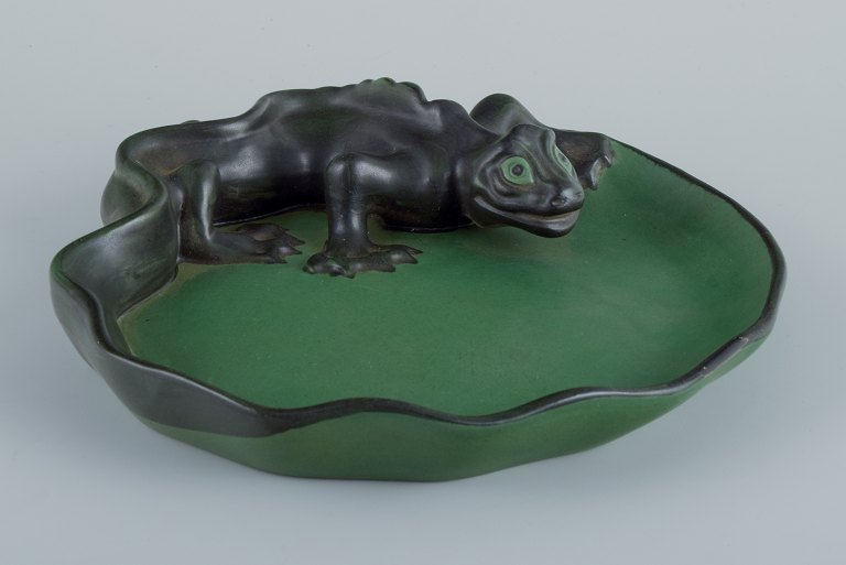 Ipsens enke, Danmark. Sjældent fad i håndmalet glaseret keramik modelleret med øgle.