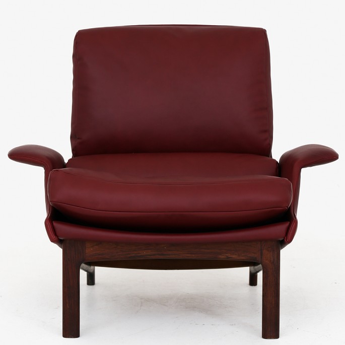 Nybetrukket lænestol og skammel i 'Elegance'-anilinlæder (farve: Indian Red) på stel af palisander. Formgivet i 1958.