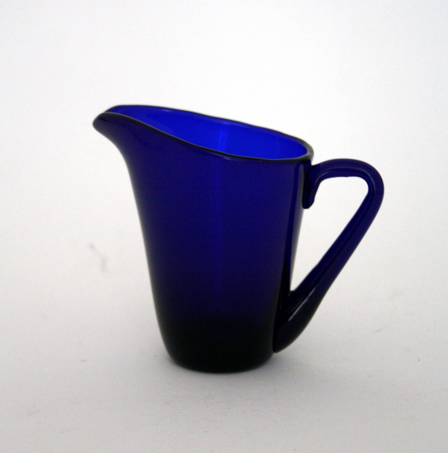 Flødekande i koboltblå glas. Rundslebet i bund. Højde 9,2 cm. Længde 11 cm. Pris: 225 kr.