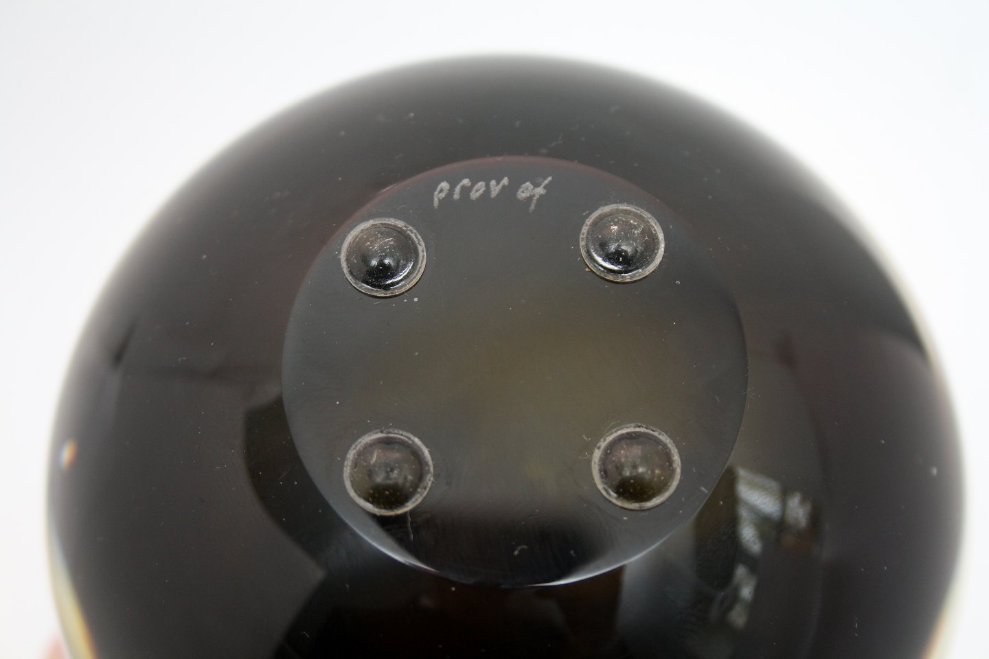 Vase i mørk flaskegrøn glas med klar overfang. Designet af Olle Brozén, som har været tilknyttet Kosta Boda i en årrække. Indgraveret i bund "Prov of". Højde 10,5 cm. Største diameter ca. 10 cm. Pris: 250 kr.